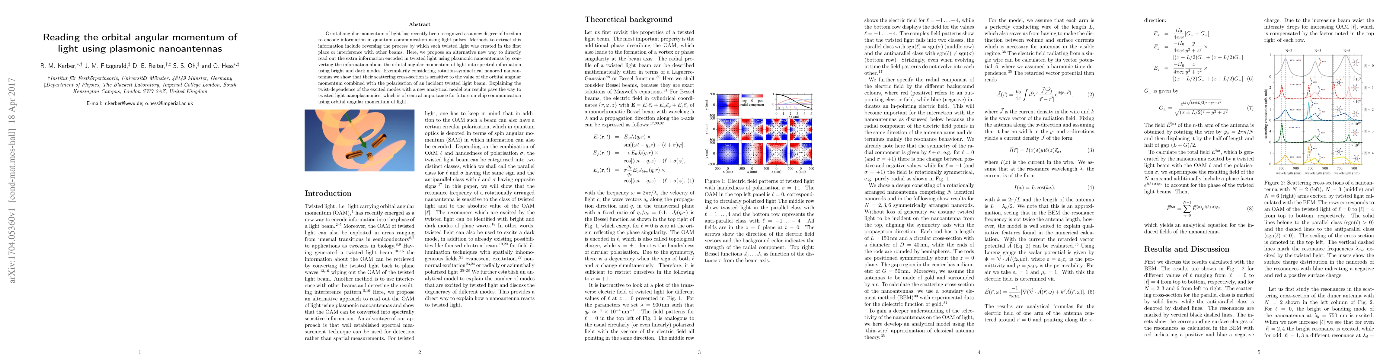 This research proposes a novel method to read out the orbital angular momentum of light using plasmonic nanoantennas, converting this information into spectral data. The study demonstrates that rotation-symmetrical nanorod nanoantennas can detect twisted light's orbital angular momentum, offering a significant advancement for future on-chip quantum communication.