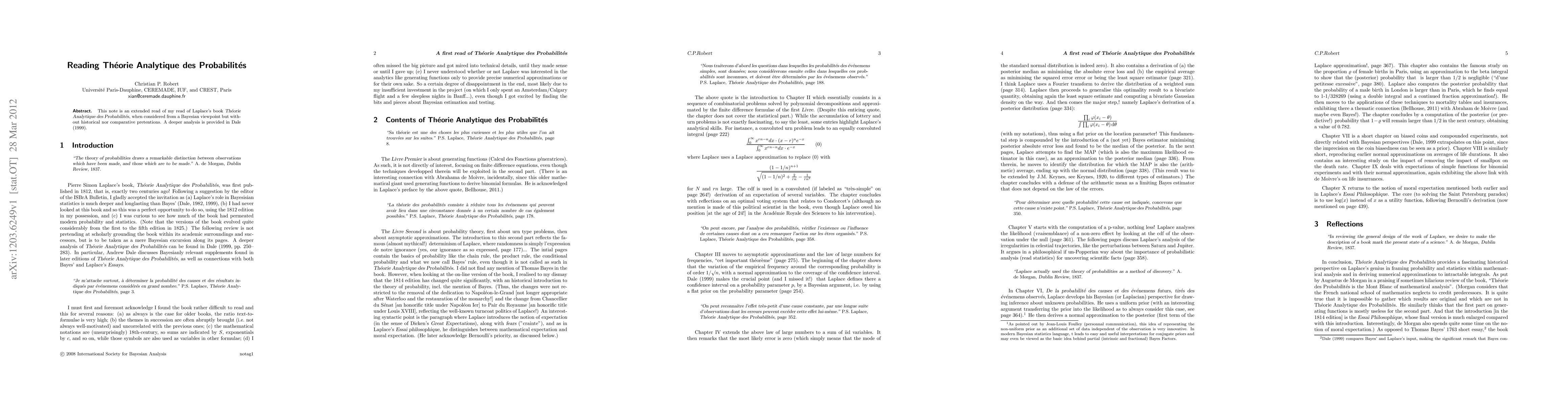 This paper presents an analytical reading of Laplace's "Theorie Analytique des Probabilites" through a Bayesian lens, focusing on the probabilistic theories without historical or comparative discussions. For a more in-depth analysis, refer to Dale (1999).