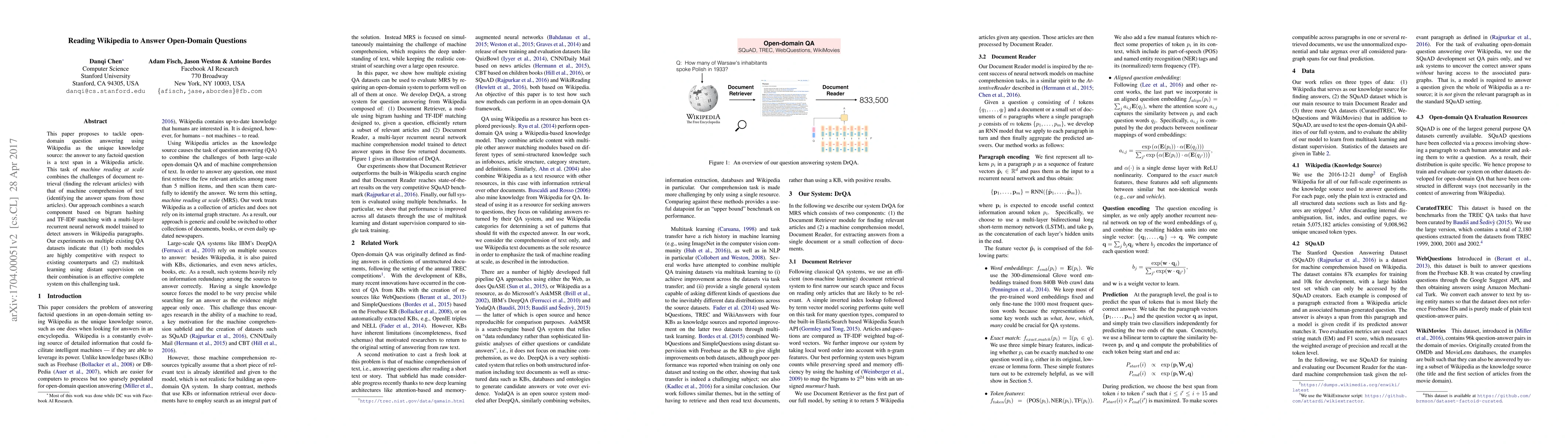 This paper proposes to tackle open- domain question answering using Wikipedia as the unique knowledge source: the answer to any factoid question is a text span in a Wikipedia article. This task of machine reading at scale combines the challenges of document retrieval (finding the relevant articles) with that of machine comprehension of text (identifying the answer spans from those articles). Our approach combines a search component based on bigram hashing and TF-IDF matching with a multi-layer recurrent neural network model trained to detect answers in Wikipedia paragraphs. Our experiments on multiple existing QA datasets indicate that (1) both modules are highly competitive with respect to existing counterparts and (2) multitask learning using distant supervision on their combination is an effective complete system on this challenging task.