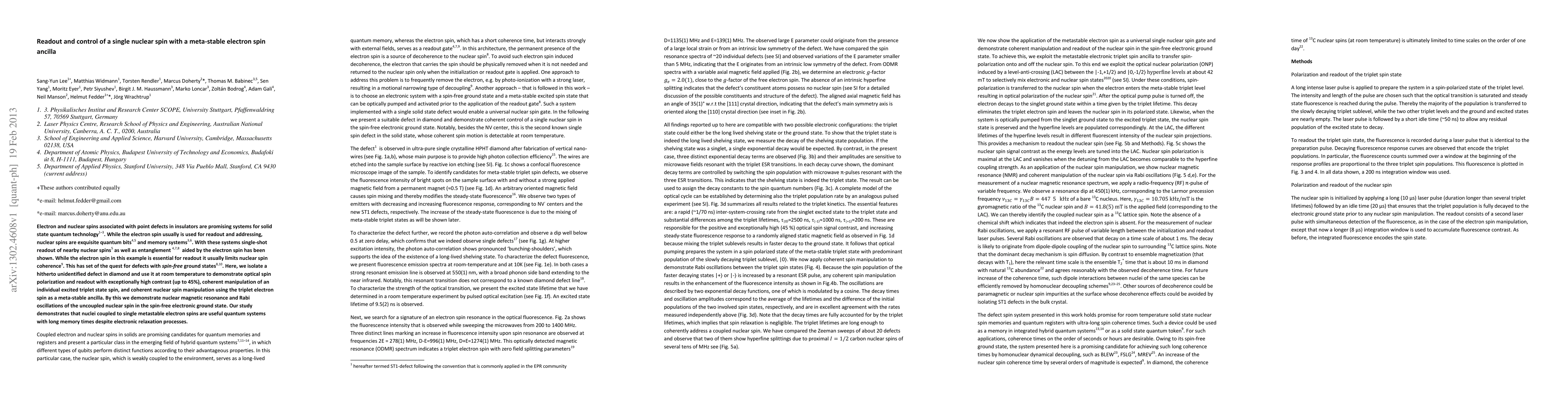 This paper demonstrates the readout and control of a single nuclear spin using a meta-stable electron spin triplet state as an ancilla in diamond, achieving high contrast optical spin polarization and coherent nuclear spin manipulation, showcasing long memory times despite electronic relaxation.