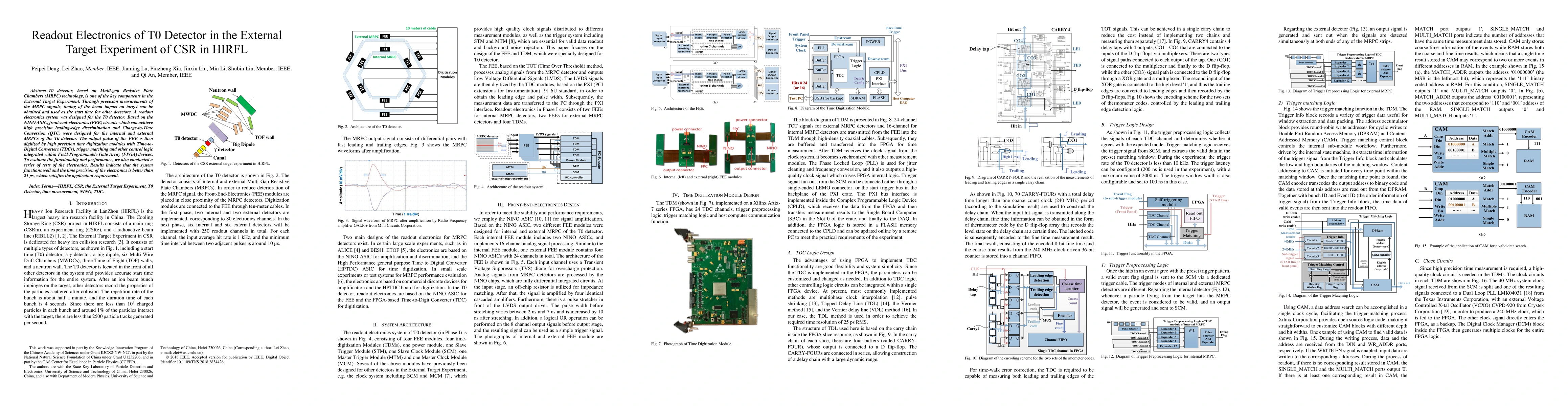This paper describes the readout electronics for the T0 detector in the CSR External Target Experiment at HIRFL, utilizing MRPC technology. The designed front-end electronics based on NINO ASIC achieve high precision timing and QTC, with time digitization modules and FPGA control logic ensuring performance better than 21 ps.