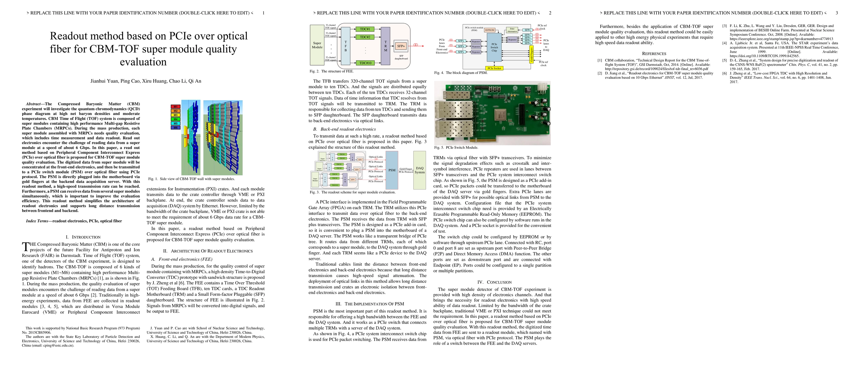 This paper proposes a PCIe over optical fiber readout method for evaluating CBM-TOF super modules, addressing the challenge of high-speed data transmission at 6 Gbps. The method uses a PCIe switch module to transmit digitized data from super modules to the backend server, simplifying the electronics architecture and enabling efficient, long-distance data transfer.