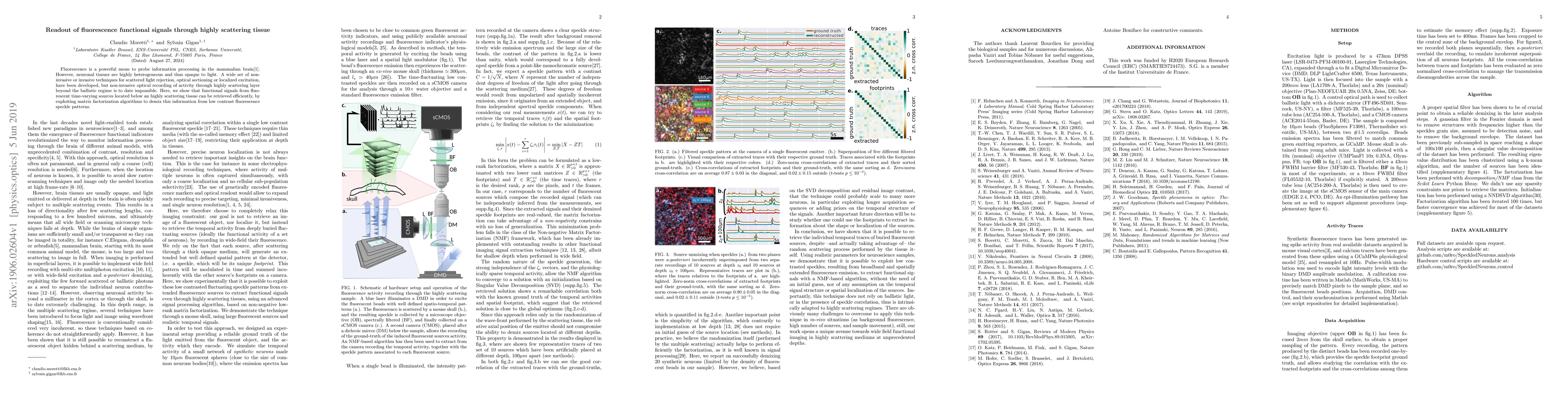 Researchers developed a method to read functional signals from fluorescent sources in highly scattering brain tissue using matrix factorization algorithms. This breakthrough enables non-invasive optical recording of activity beyond the ballistic regime.