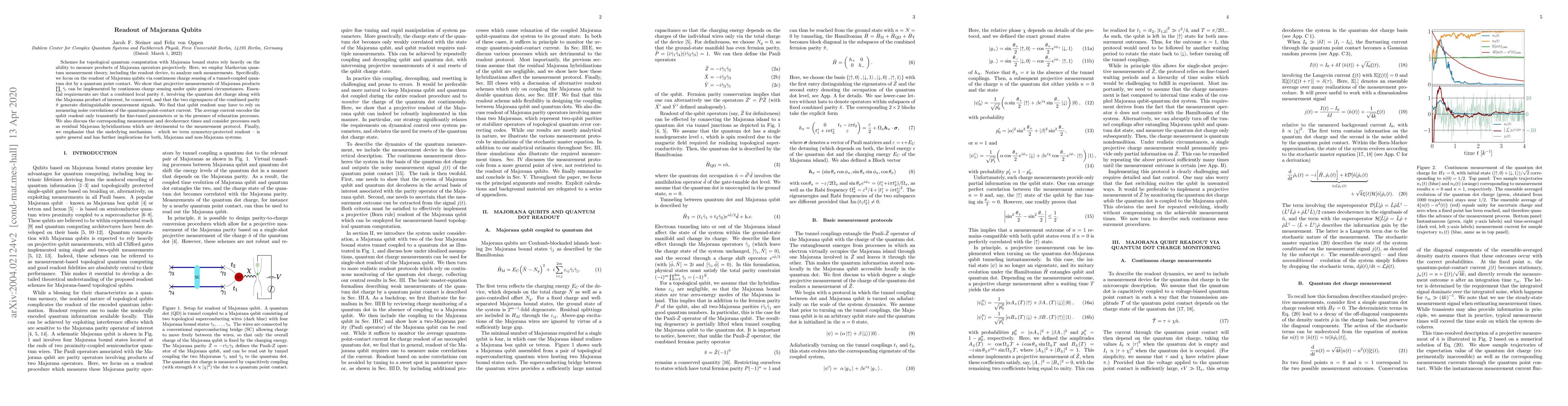 This paper investigates the readout of Majorana qubits through continuous charge sensing in a tunnel-coupled quantum dot via a quantum point contact, proposing a projective measurement method based on symmetry-protected readout. The study also examines measurement and decoherence times, and highlights the general applicability of the method across different quantum systems.
