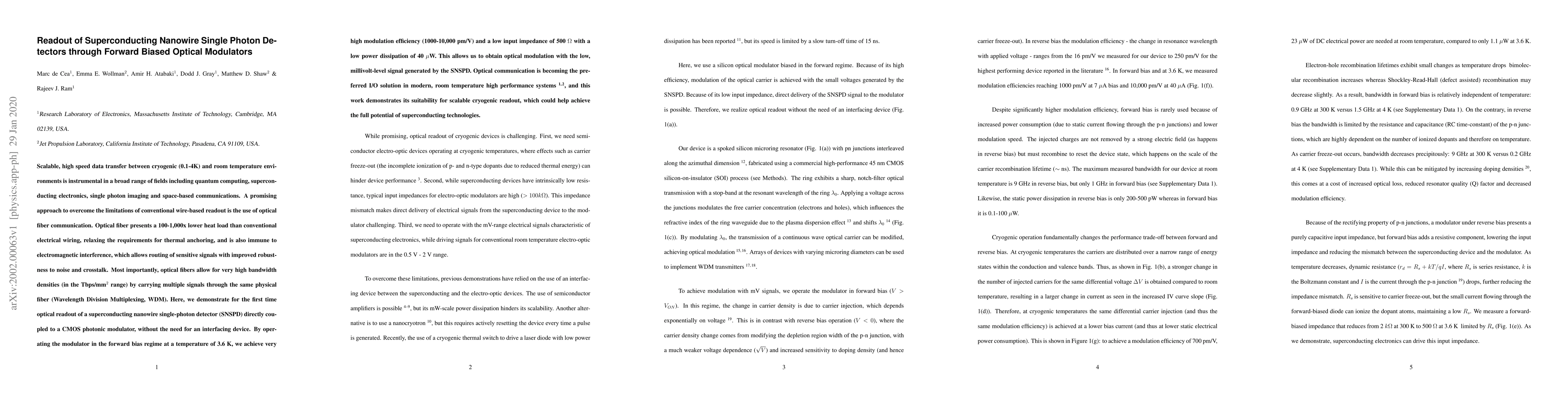 Scalable, high speed data transfer between cryogenic (0.1-4 K) and room temperature environments is instrumental in a broad range of fields including quantum computing, superconducting electronics, single photon imaging and space-based communications. A promising approach to overcome the limitations of conventional wire-based readout is the use of optical fiber communication. Optical fiber presents a 100-1,000x lower heat load than conventional electrical wiring, relaxing the requirements for thermal anchoring, and is also immune to electromagnetic interference, which allows routing of sensitive signals with improved robustness to noise and crosstalk. Most importantly, optical fibers allow for very high bandwidth densities (in the Tbps/mm$^2$ range) by carrying multiple signals through the same physical fiber (Wavelength Division Multiplexing, WDM). Here, we demonstrate for the first time optical readout of a superconducting nanowire single-photon detector (SNSPD) directly coupled to a CMOS photonic modulator, without the need for an interfacing device. By operating the modulator in the forward bias regime at a temperature of 3.6 K, we achieve very high modulation efficiency (1000-10,000 pm/V) and a low input impedance of 500 $\Omega$ with a low power dissipation of 40 $\mu$W. This allows us to obtain optical modulation with the low, millivolt-level signal generated by the SNSPD. Optical communication is becoming the preferred I/O solution in modern, room temperature high performance systems, and this work demonstrates its suitability for scalable cryogenic readout, which could help achieve the full potential of superconducting technologies.