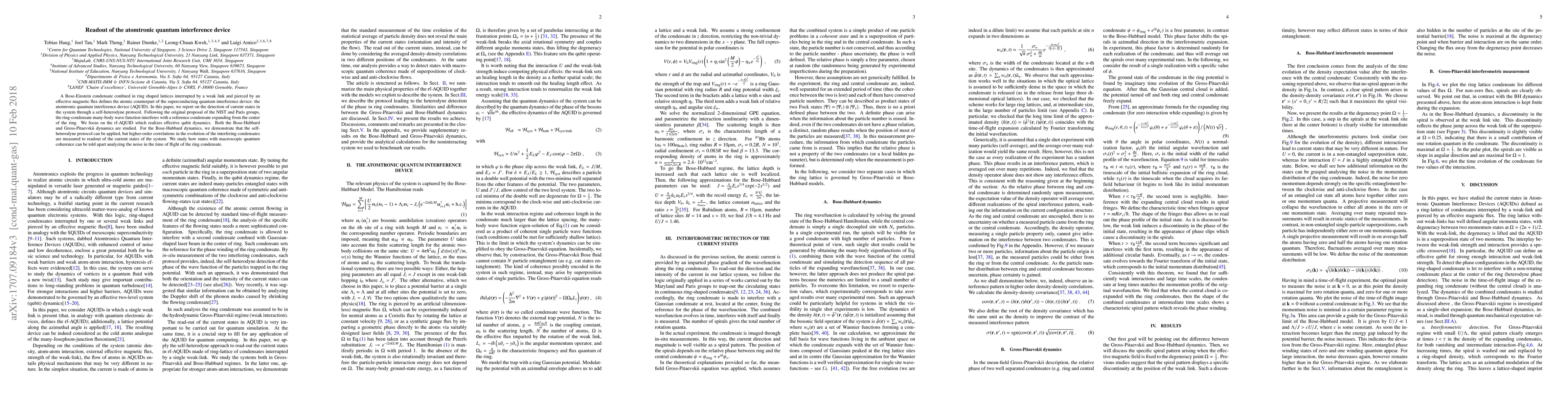 A Bose-Einstein condensate confined in ring shaped lattices interrupted by a weak link and pierced by an effective magnetic flux defines the atomic counterpart of the superconducting quantum interference device: the atomtronic quantum interference device (AQUID). In this paper, we report on the detection of current states in the system through a self-heterodyne protocol. Following the original proposal of the NIST and Paris groups, the ring-condensate many-body wave function interferes with a reference condensate expanding from the center of the ring. We focus on the rf-AQUID which realizes effective qubit dynamics. Both the Bose-Hubbard and Gross-Pitaevskii dynamics are studied. For the Bose-Hubbard dynamics, we demonstrate that the self-heterodyne protocol can be applied, but higher-order correlations in the evolution of the interfering condensates are measured to readout of the current states of the system. We study how states with macroscopic quantum coherence can be told apart analyzing the noise in the time of flight of the ring condensate.