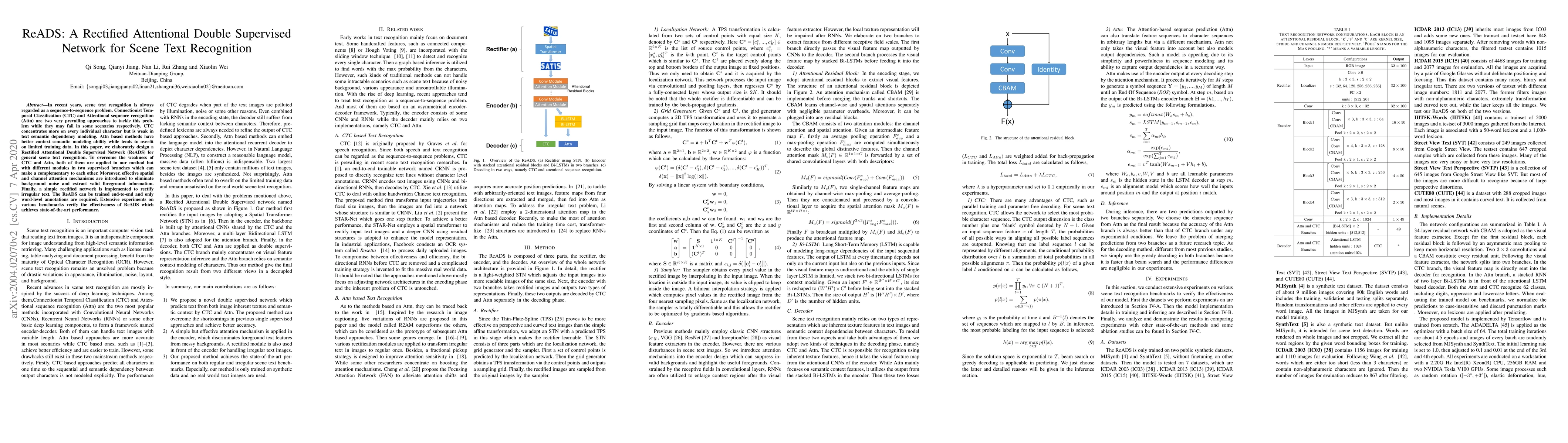 The paper introduces ReADS, a Rectified Attentional Double Supervised Network for scene text recognition, combining CTC and attentional sequence recognition to address their respective weaknesses. The method uses spatial and channel attention to focus on relevant text features and achieves state-of-the-art performance on various benchmarks.