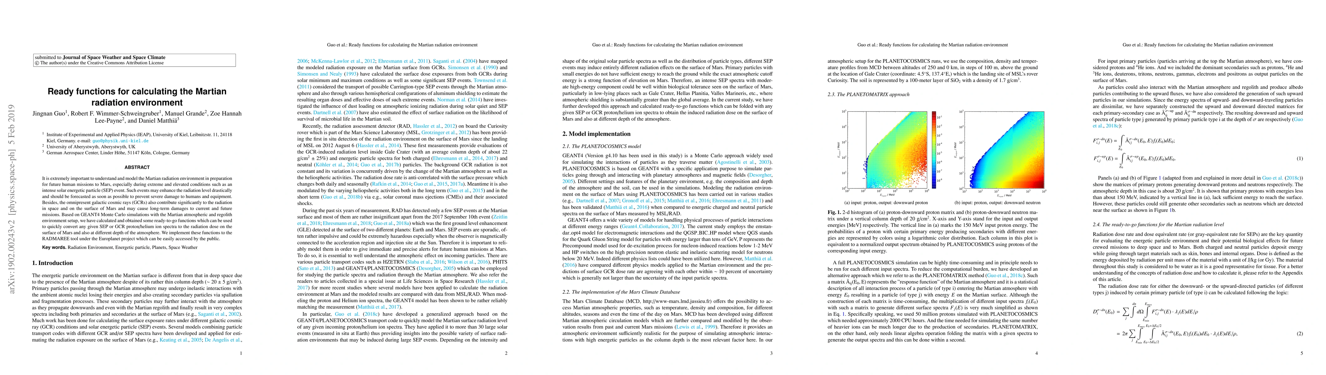 It is extremely important to understand and model the Martian radiation environment in preparation for future human missions to Mars, especially during extreme and elevated conditions such as an intense solar energetic particle (SEP) event. Such events may enhance the radiation level drastically and should be forecasted as soon as possible to prevent severe damage to humans and equipment. Besides, the omnipresent galactic cosmic rays (GCRs) also contribute significantly to the radiation in space and on the surface of Mars and may cause long-term damages to current and future missions. Based on GEANT4 Monte Carlo simulations with the Martian atmospheric and regolith environment setup, we have calculated and obtained some ready-to-go functions which can be used to quickly convert any given SEP or GCR proton/helium ion spectra to the radiation dose on the surface of Mars and also at different depth of the atmosphere. We implement these functions to the RADMAREE tool under the Europlanet project which can be easily accessed by the public.