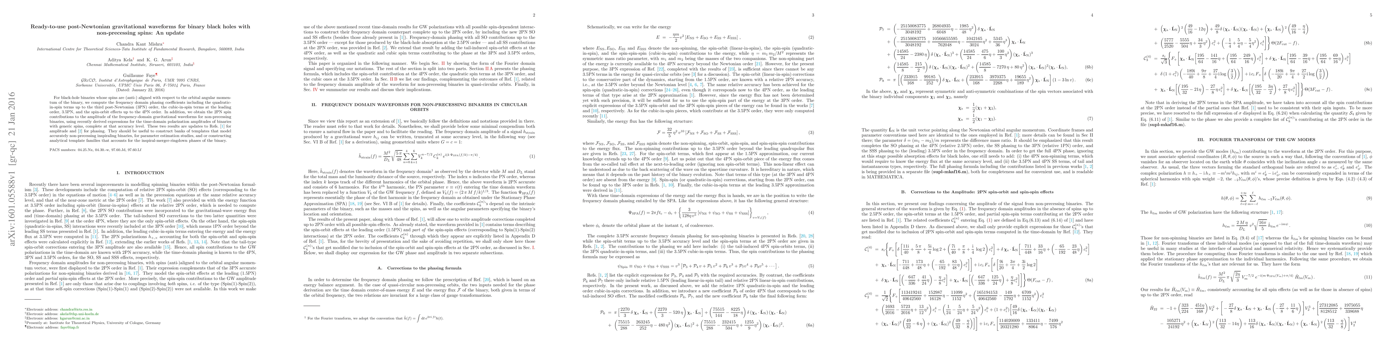 For black-hole binaries whose spins are (anti-) aligned with respect to the orbital angular momentum of the binary, we compute the frequency domain phasing coefficients including the quadratic-in-spin terms up to the third post-Newtonian (3PN) order, the cubic-in-spin terms at the leading order, 3.5PN, and the spin-orbit effects up to the 4PN order. In addition, we obtain the 2PN spin contributions to the amplitude of the frequency-domain gravitational waveforms for non-precessing binaries, using recently derived expressions for the time-domain polarization amplitudes of binaries with generic spins, complete at that accuracy level. These two results are updates to Arun et al. (2009) [1] for amplitude and Wade et al. (2013) [2] for phasing. They should be useful to construct banks of templates that model accurately non-precessing inspiraling binaries, for parameter estimation studies, and or constructing analytical template families that accounts for the inspiral-merger-ringdown phases of the binary.