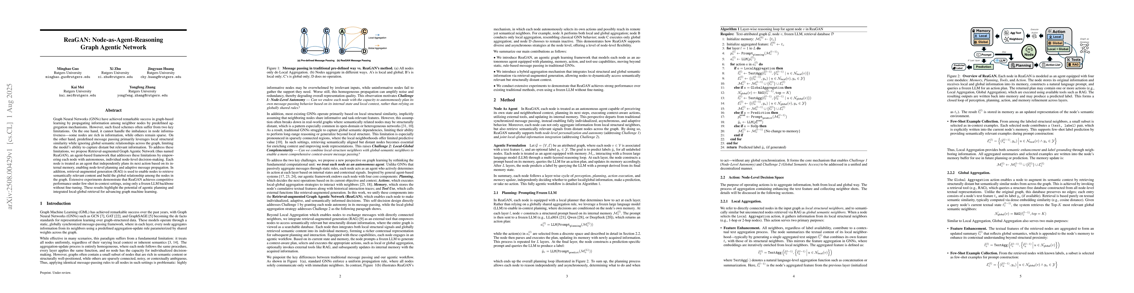 Graph Neural Networks (GNNs) have achieved remarkable success in graph-based learning by propagating information among neighbor nodes via predefined aggregation mechanisms. However, such fixed schemes often suffer from two key limitations. First, they cannot handle the imbalance in node informativeness -- some nodes are rich in information, while others remain sparse. Second, predefined message passing primarily leverages local structural similarity while ignoring global semantic relationships across the graph, limiting the model's ability to capture distant but relevant information. We propose Retrieval-augmented Graph Agentic Network (ReaGAN), an agent-based framework that empowers each node with autonomous, node-level decision-making. Each node acts as an agent that independently plans its next action based on its internal memory, enabling node-level planning and adaptive message propagation. Additionally, retrieval-augmented generation (RAG) allows nodes to access semantically relevant content and build global relationships in the graph. ReaGAN achieves competitive performance under few-shot in-context settings using a frozen LLM backbone without fine-tuning, showcasing the potential of agentic planning and local-global retrieval in graph learning.