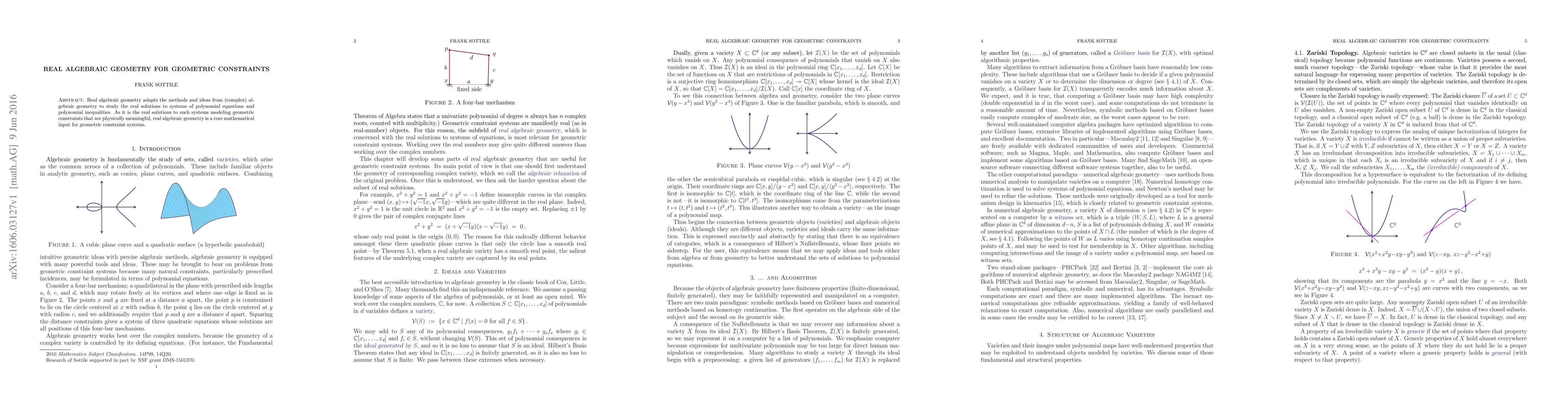 Summary: Real algebraic geometry applies techniques from complex algebraic geometry to identify real solutions of polynomial equations and inequalities, which are crucial for modeling physically meaningful geometric constraints in systems.