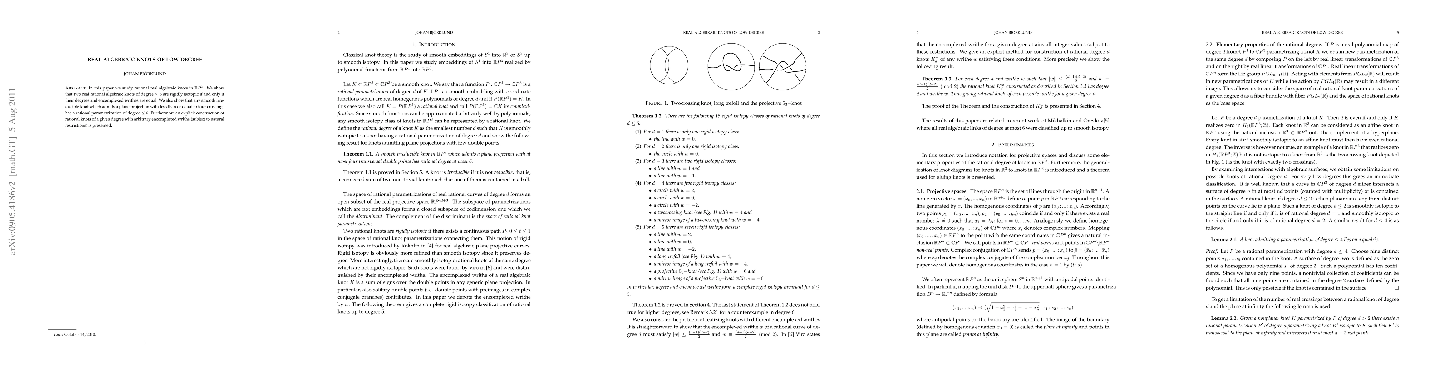 Summary: The paper investigates rational real algebraic knots in $\R P^3$, proving that degree $\leq5$ knots are rigidly isotopic if their degrees and encomplexed writhes match. It also shows that irreducible smooth knots with up to four crossings have rational parametrizations of degree $\leq 6$, alongside an explicit construction method for rational knots of specific degrees and writhes.