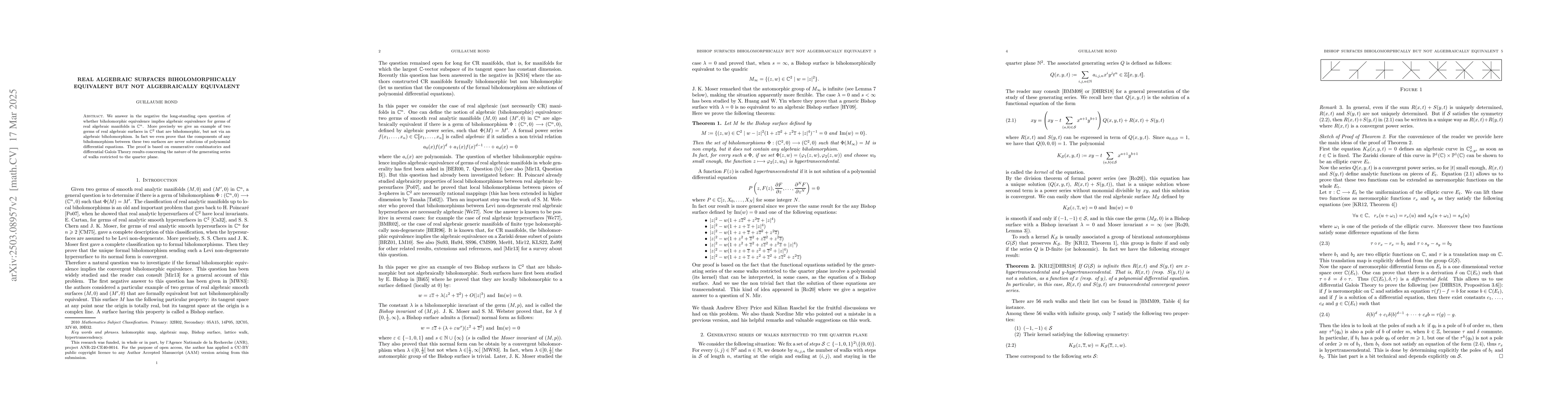 The paper establishes a counterexample to the algebraic equivalence of biholomorphically equivalent real algebraic surfaces in $\mathbb C^2$, using sophisticated mathematical techniques from enumerative combinatorics and differential Galois Theory.