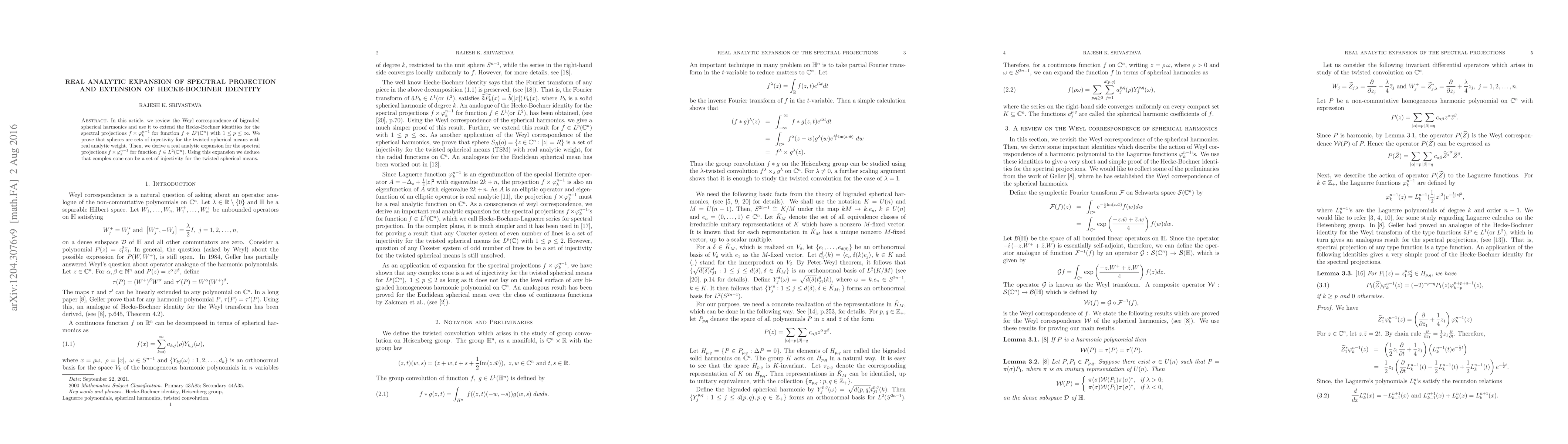 In this article, we review the Weyl correspondence of bigraded spherical harmonics and use it to extend the Hecke-Bochner identities for the spectral projections $f\times\varphi_k^{n-1}$ for function $f\in L^p(\mathbb C^n)$ with $1\leq p\leq\infty.$ We prove that spheres are sets of injectivity for the twisted spherical means with real analytic weight. Then, we derive a real analytic expansion for the spectral projections $f\times\varphi_k^{n-1}$ for function $f\in L^2(\mathbb C^n).$