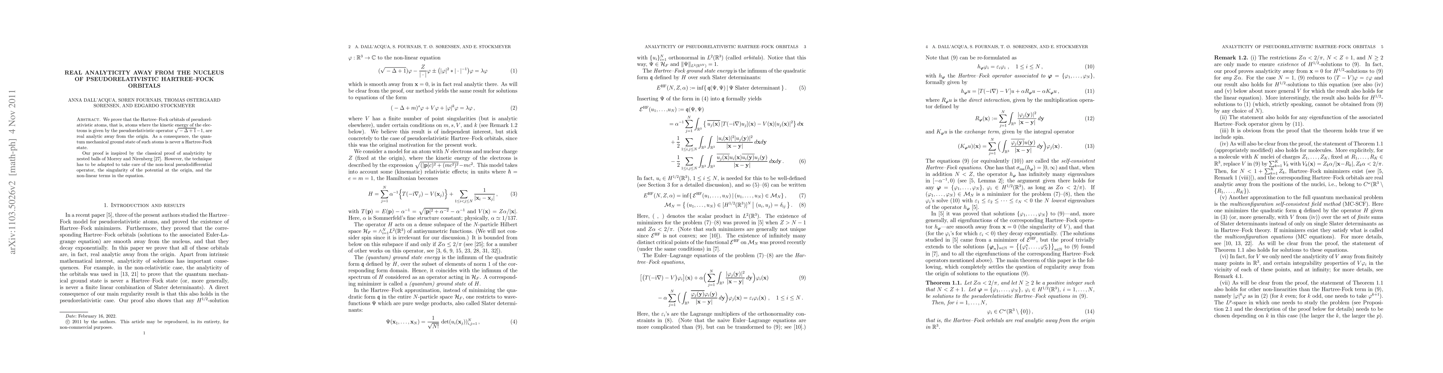 We prove that the Hartree--Fock orbitals of pseudorelativistic atoms, that is, atoms where the kinetic energy of the electrons is given by the pseudorelativistic operator sqrt{-Delta+1}-1, are real analytic away from the origin. As a consequence, the quantum mechanical ground state of such atoms is never a Hartree-Fock state. Our proof is inspired by the classical proof of analyticity by nested balls of Morrey and Nirenberg. However, the technique has to be adapted to take care of the non-local pseudodifferential operator, the singularity of the potential at the origin, and the non-linear terms in the equation.