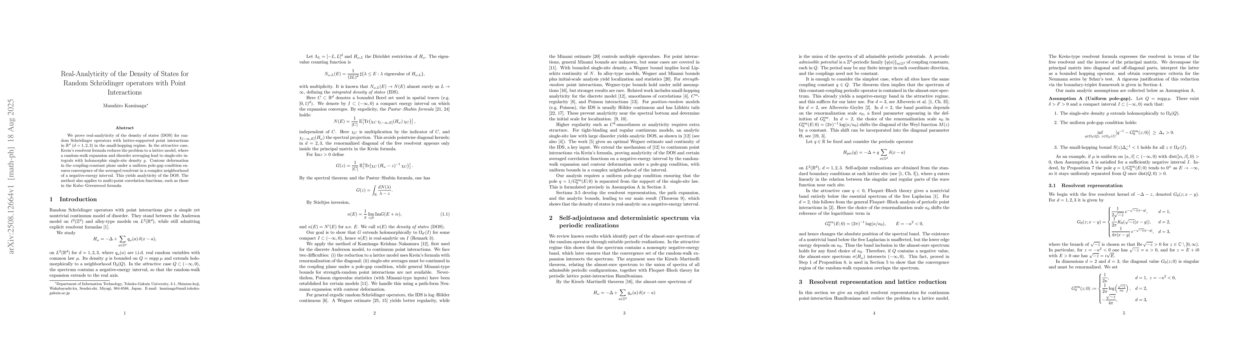 We prove real-analyticity of the density of states (DOS) for random Schr\"odinger operators with lattice-supported point interactions in $\mathbb{R}^d$ ($d=1,2,3$) in the small-hopping regime. In the attractive case, Krein's resolvent formula reduces the problem to a lattice model, where a random-walk expansion and disorder averaging lead to single-site integrals with holomorphic single-site density $g$. Contour deformation in the coupling-constant plane under a uniform pole-gap condition ensures convergence of the averaged resolvent in a complex neighborhood of a negative-energy interval. This yields analyticity of the DOS. The method also applies to multi-point correlation functions, such as those in the Kubo--Greenwood formula.