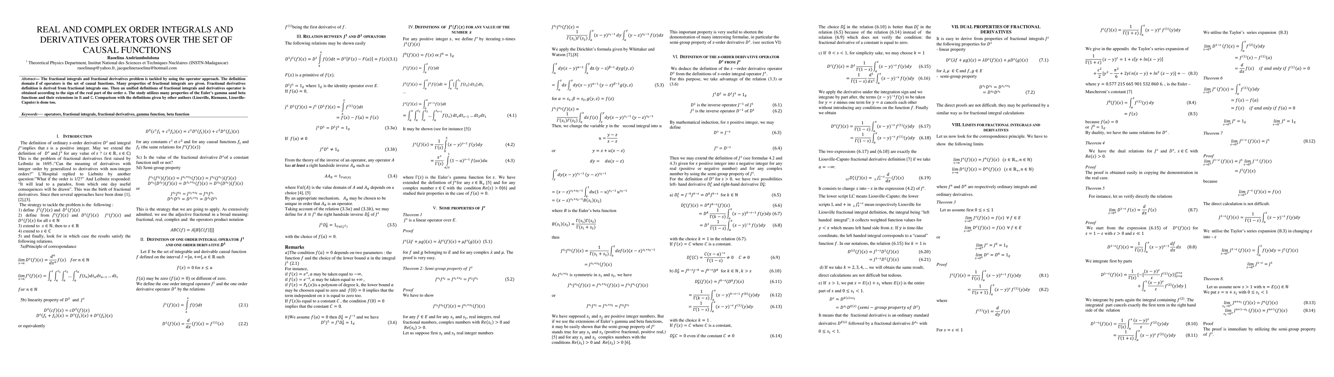 The fractional integrals and fractional derivatives problem is tackled by using the operator approach. The definition domain E of operators is causal functions.Many properties of fractional integrals are given. Fractional derivatives definition is derived from fractional integrals one. Then an unified definition of fractional integrals and derivatives operator is obtained according to the sign of the real part of the order s. The study utilizes many properties of the Euler's gamma and beta functions and their extensions in R and C. Comparison with the definitions given by other authors (Liouville, Riemann,Liouville-Caputo)is done too.