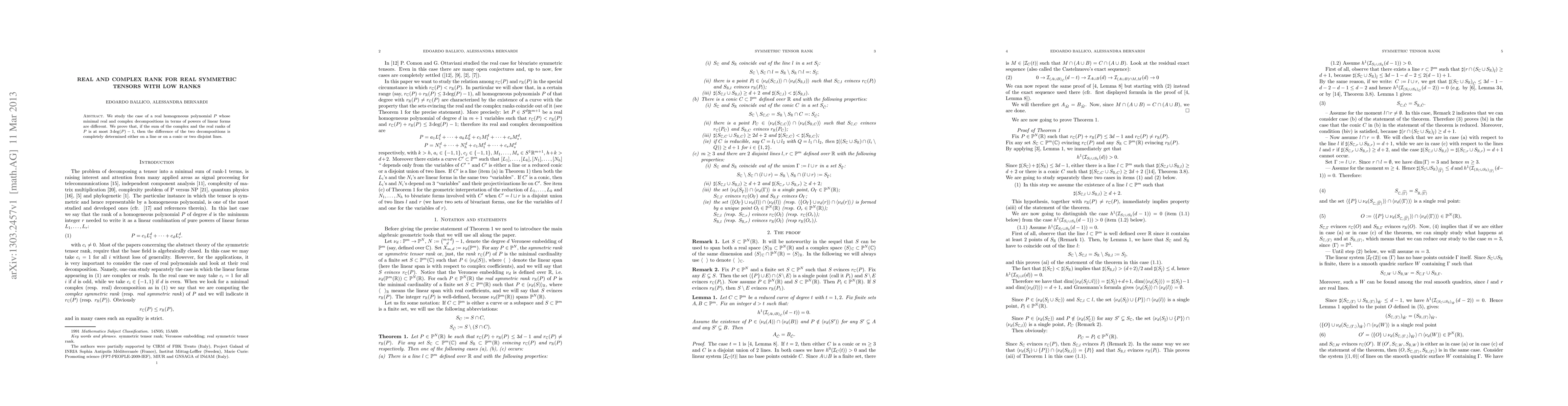 The paper investigates the discrepancy between the real and complex ranks of real symmetric tensors, proving that when their combined rank is at most $3\deg(P)-1$, the difference in decompositions is constrained to specific geometric configurations like lines or conics.