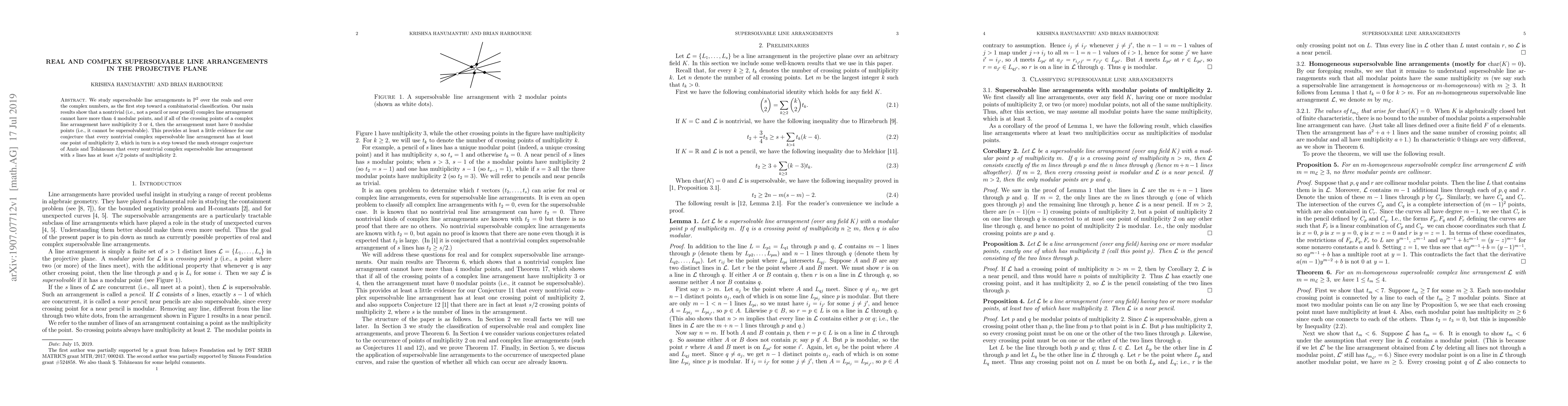 This paper explores supersolvable line arrangements in the projective plane over real and complex numbers, establishing that nontrivial complex arrangements have at most 4 modular points, and those with all crossing points of multiplicity 3 or 4 have none, supporting a conjecture about the existence of points of multiplicity 2 in such arrangements.