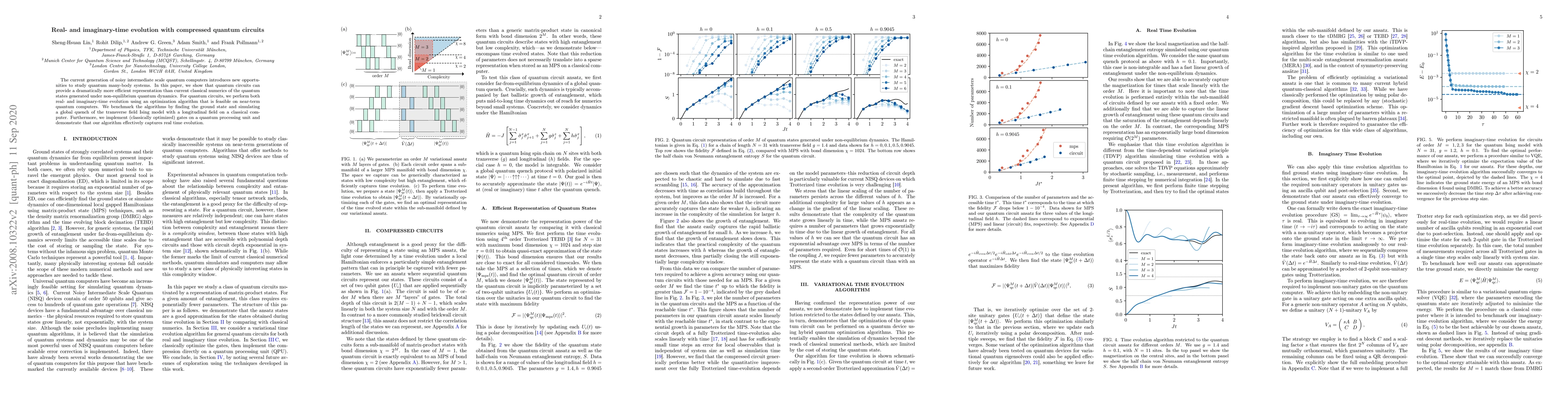 This paper proposes a method to efficiently represent and simulate non-equilibrium quantum dynamics using compressed quantum circuits. It introduces an optimization algorithm for both real- and imaginary-time evolution feasible on near-term quantum computers, validated through ground state calculations and global quench simulations of the Ising model.
