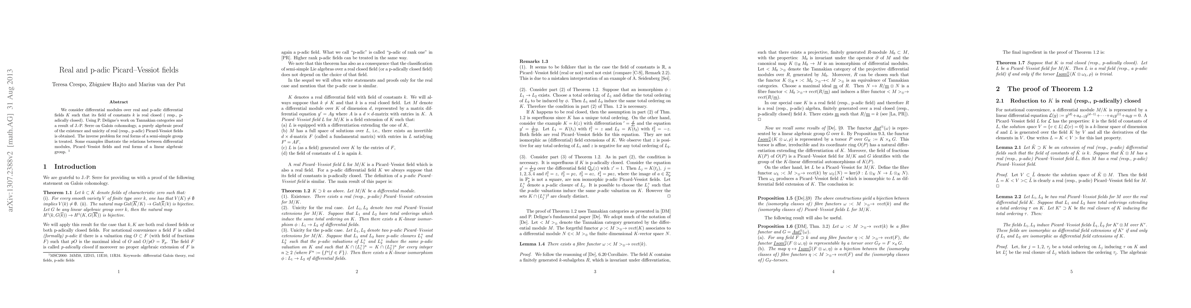 The paper establishes the existence and uniqueness of real and p-adic Picard-Vessiot fields for differential modules over real and p-adic differential fields, utilizing Deligne's Tannakian categories and Serre's Galois cohomology for purely algebraic proofs.