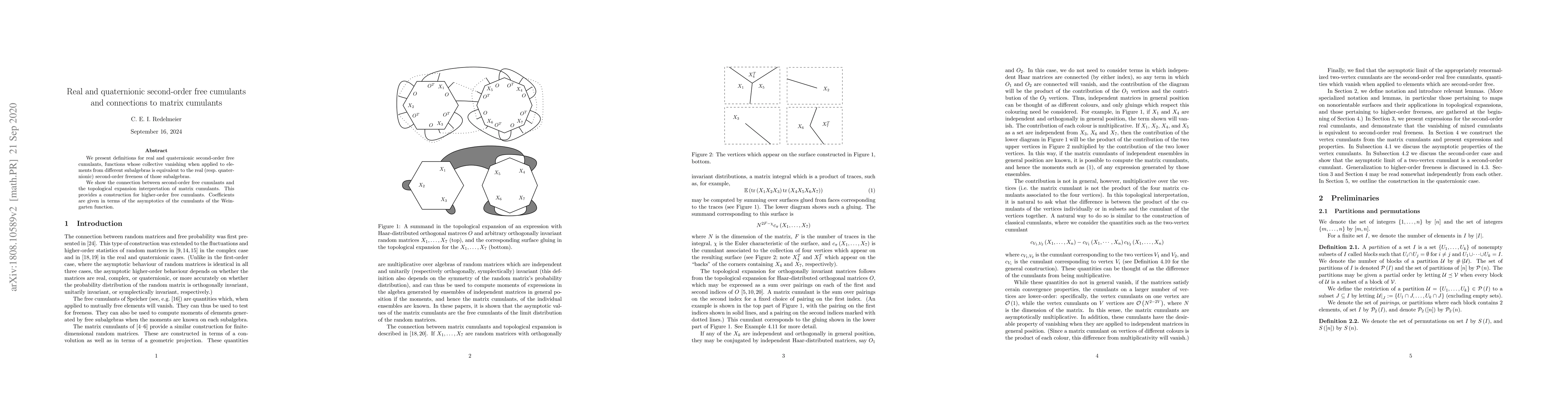We present definitions for real and quaternionic second-order free cumulants, functions whose collective vanshing when applied to elements from different subalgebras is equivalent to the second-order real (resp.\ quaternionic) freeness of those subalgebras. We construct a poset related to the annular noncrossing partitions, and calculate the M\"{o}bius function, which may be used to compute the coefficients in the expression for the second-order free cumulants. We show the connection between second-order free cumulants and the topological expansion interpretation of matrix cumulants. This provides a construction for higher-order free cumulants. Coefficients are given in terms of the asymptotics of the cumulants of the Weingarten function.