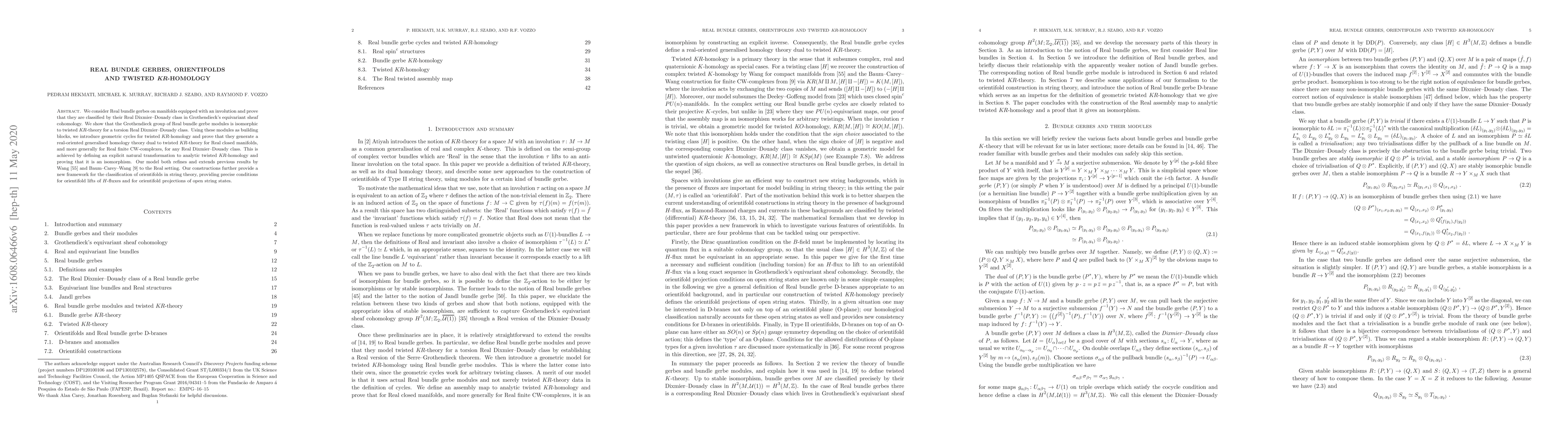 This paper classifies Real bundle gerbes on manifolds with involutions using Grothendieck's equivariant sheaf cohomology and connects them to twisted KR-homology. It introduces geometric cycles that generate a real-oriented generalized homology theory, refining and extending previous classifications in string theory.