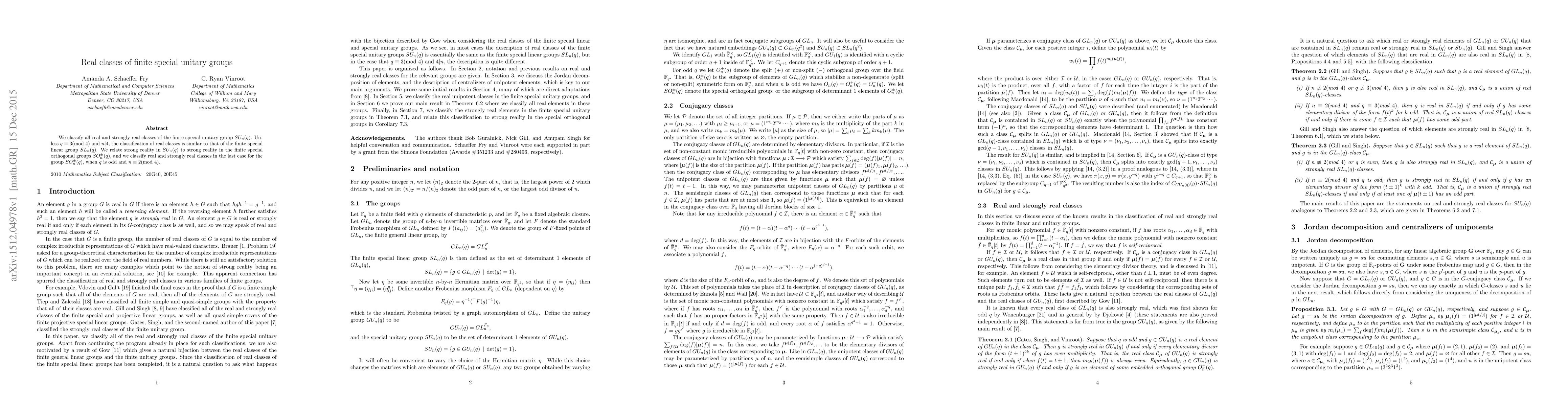 This paper classifies real and strongly real classes of the finite special unitary group $SU_n(q)$, showing that their classification resembles that of $SL_n(q)$ unless $q \equiv 3 \pmod{4}$ and $n | 4$. It also relates strong reality in $SU_n(q)$ to $SO^\pm_n(q)$ and classifies real and strongly real classes for $SO^\pm_n(q)$ when $q$ is odd and $n \equiv 2 \pmod{4}$.