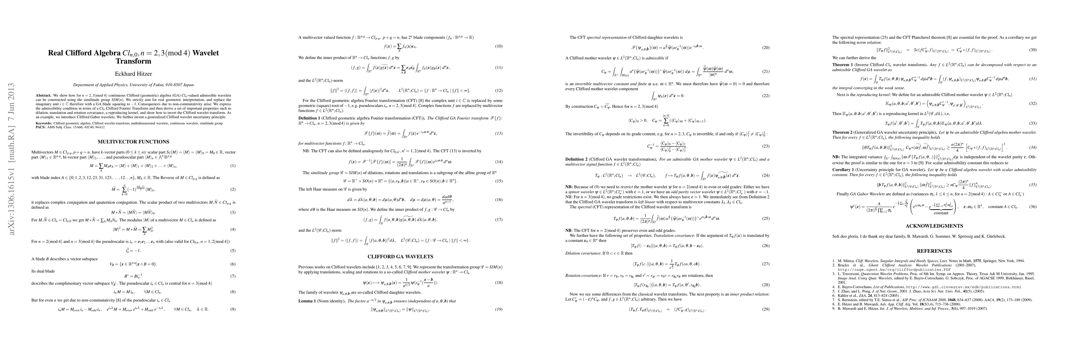 This paper constructs $Cl_n$-valued admissible wavelets for $n=2,3$ (mod 4) using the similitude group, focusing on real geometric interpretations with non-commutative consequences. It derives properties such as dilation, translation, and rotation covariance, introduces Clifford Gabor wavelets, and proposes a generalized Clifford wavelet uncertainty principle.