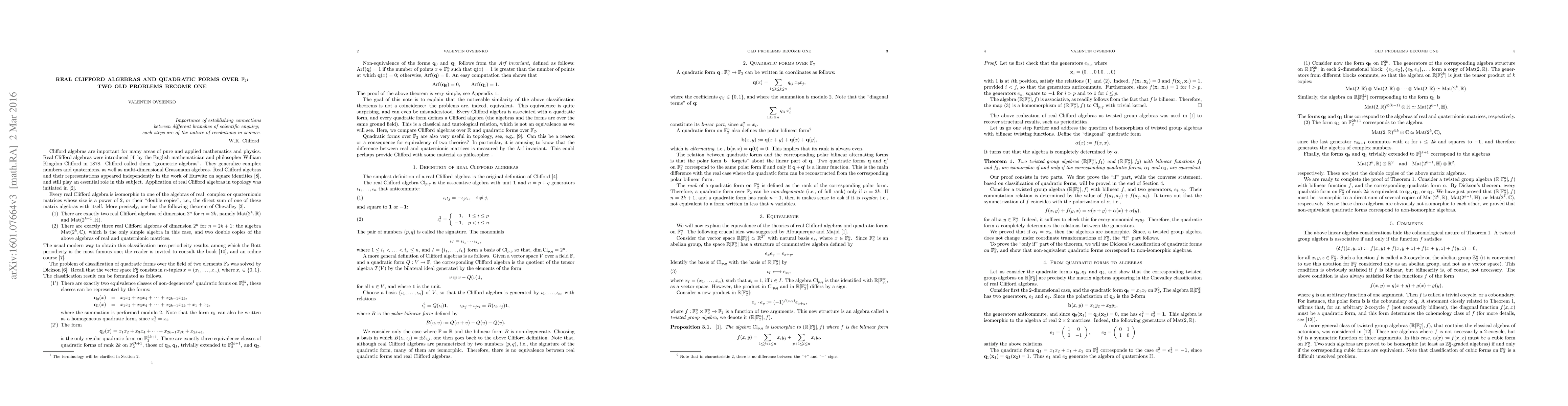 We show equivalence of two old classification theorems: Dickson's classification of quadratic forms over ${\mathbb F}_2$, and Chevalley's classification of real Clifford algebras.