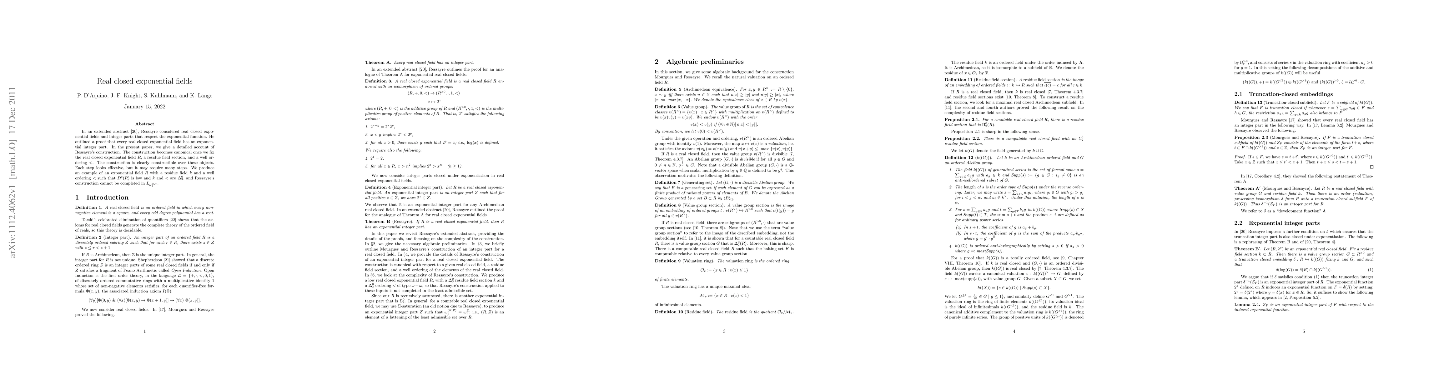 In an extended abstract Ressayre considered real closed exponential fields and integer parts that respect the exponential function. He outlined a proof that every real closed exponential field has an exponential integer part. In the present paper, we give a detailed account of Ressayre's construction, which becomes canonical once we fix the real closed exponential field, a residue field section, and a well ordering of the field. The procedure is constructible over these objects; each step looks effective, but may require many steps. We produce an example of an exponential field $R$ with a residue field $k$ and a well ordering $<$ such that $D^c(R)$ is low and $k$ and $<$ are $\Delta^0_3$, and Ressayre's construction cannot be completed in $L_{\omega_1^{CK}}$.