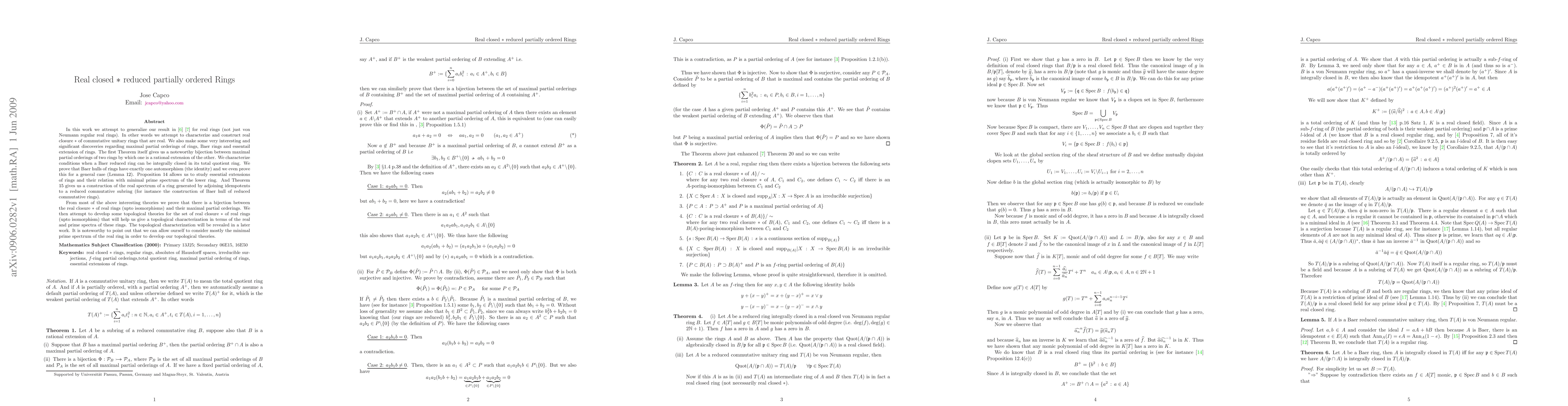 In this work we attempt to generalize our result in [6] [7] for real rings (not just von Neumann regular real rings). In other words we attempt to characterize and construct real closure * of commutative unitary rings that are real. We also make some very interesting and significant discoveries regarding maximal partial orderings of rings, Baer rings and essentail extension of rings. The first Theorem itself gives us a noteworthy bijection between maximal partial orderings of two rings by which one is a rational extension of the other. We characterize conditions when a Baer reduced ring can be integrally closed in its total quotient ring. We prove that Baer hulls of rings have exactly one automorphism (the identity) and we even prove this for a general case (Lemma 12). Proposition 14 allows us to study essential extensions of rings and their relation with minimal prime spectrum of the lower ring. And Theorem 15 gives us a construction of the real spectrum of a ring generated by adjoining idempotents to a reduced commutative subring (for instance the construction of Baer hull of reduced commutative rings). From most of the above interesting theories we prove that there is a bijection between the real closure * of real rings (upto isomorphisms) and their maximal partial orderings. We then attempt to develop some topological theories for the set of real closure * of real rings (upto isomorphism) that will help us give a topological characterization in terms of the real and prime spectra of these rings. The topological characterization will be revealed in a later work. It is noteworthy to point out that we can allow ourself to consider mostly the minimal prime spectrum of the real ring in order to develop our topological theories.