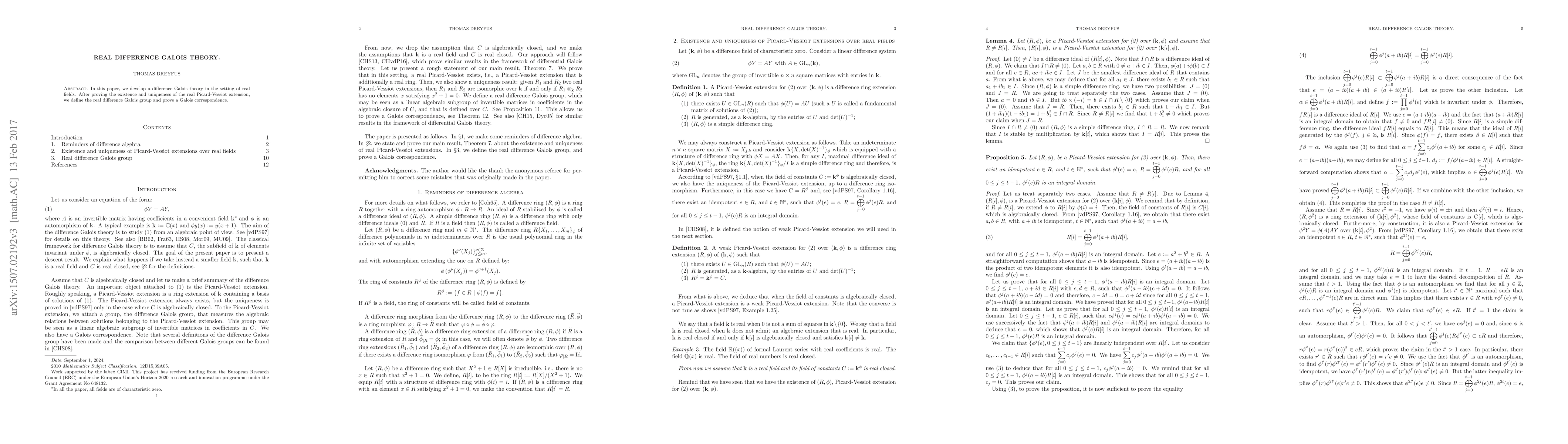 This paper develops real difference Galois theory, establishing the existence and uniqueness of the real Picard-Vessiot extension, and defines the real difference Galois group, proving a Galois correspondence.