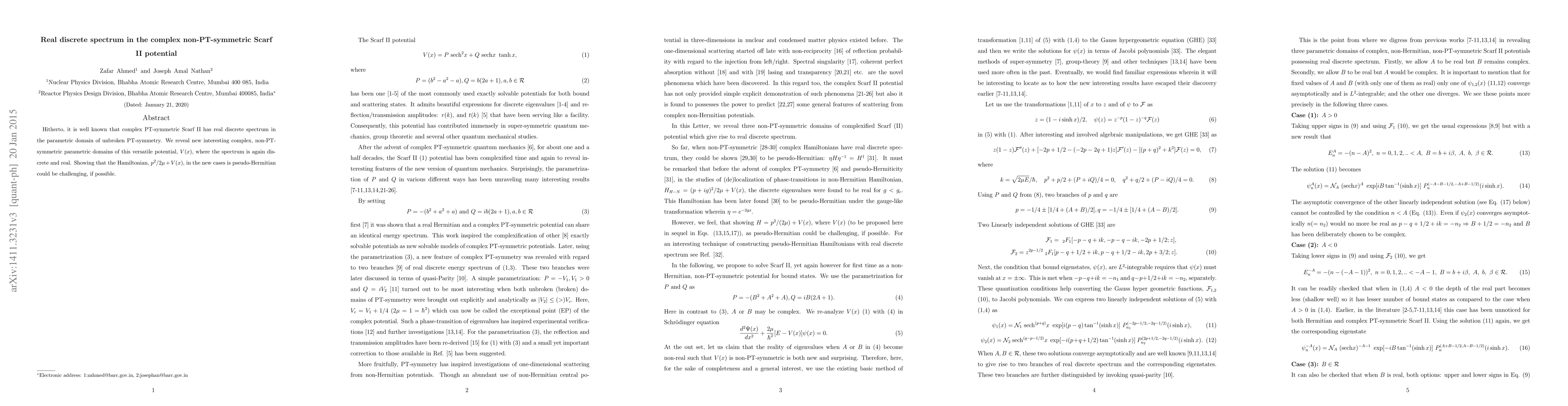 This paper explores the complex, non-PT-symmetric regions of the Scarf II potential, demonstrating that it still possesses a real discrete spectrum. The Hamiltonian in these new domains may be pseudo-Hermitian, though proving this remains challenging.