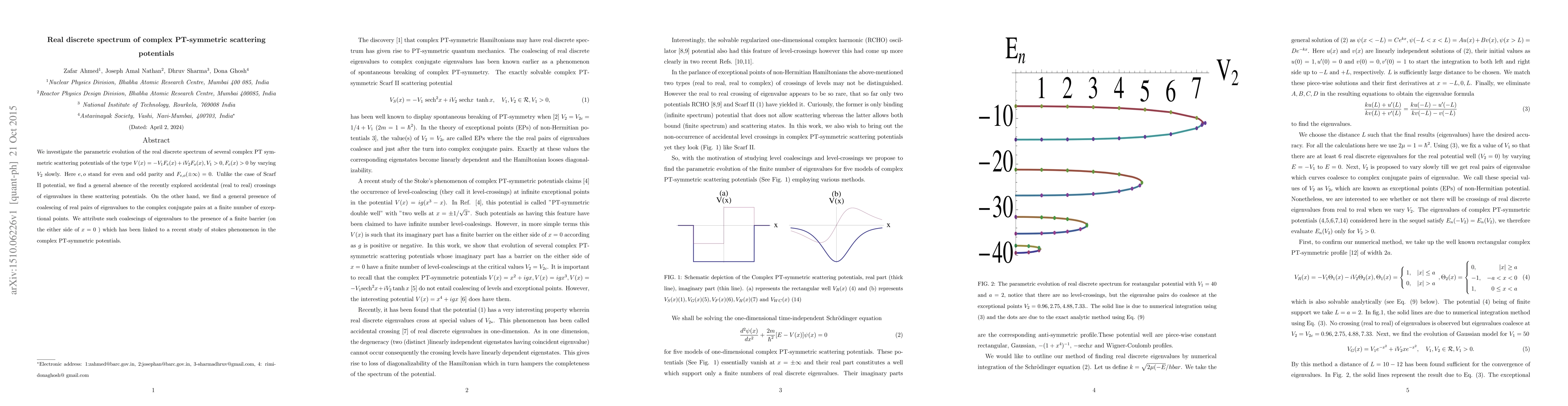 This paper explores the evolution of the real discrete spectrum in complex PT-symmetric scattering potentials, finding no accidental crossings of eigenvalues but observing coalescing of real pairs into complex conjugate pairs at exceptional points, attributed to a finite barrier linked to Stokes phenomenon studies.