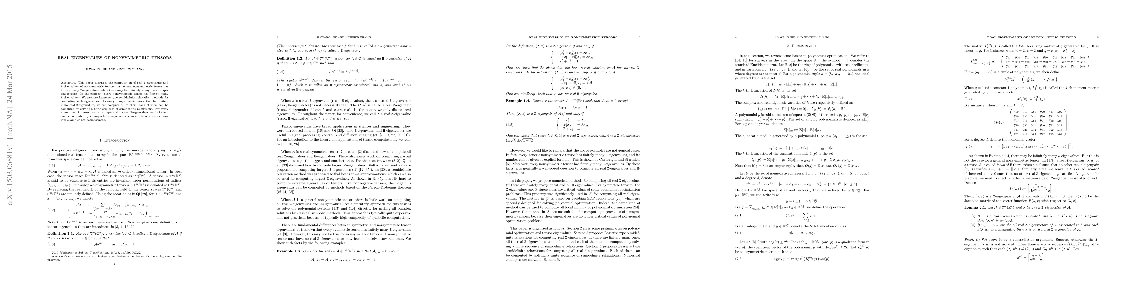 This paper proposes Lasserre type semidefinite relaxation methods to compute real Z-eigenvalues and H-eigenvalues of nonsymmetric tensors, showing that all real Z-eigenvalues and finitely many H-eigenvalues can be computed through a finite sequence of semidefinite relaxations. Examples are provided to demonstrate the method's effectiveness.