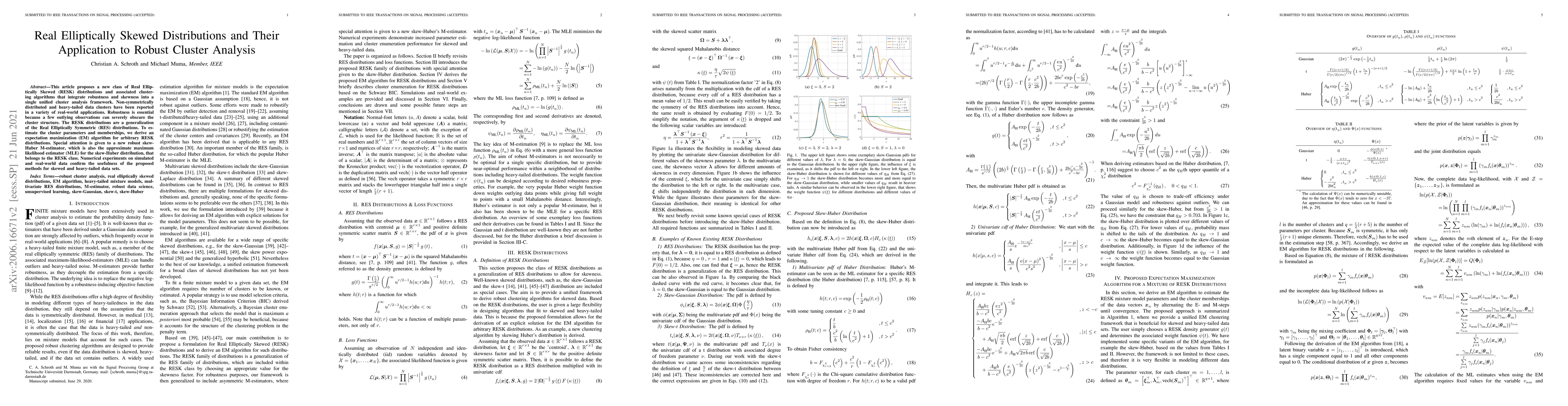 This paper introduces Real Elliptically Skewed (RESK) distributions and clustering algorithms that combine robustness and skewness for cluster analysis. An expectation maximization algorithm is developed to estimate cluster parameters, with a focus on a robust skew-Huber M-estimator, and experiments show the methods' effectiveness on skewed and heavy-tailed data.