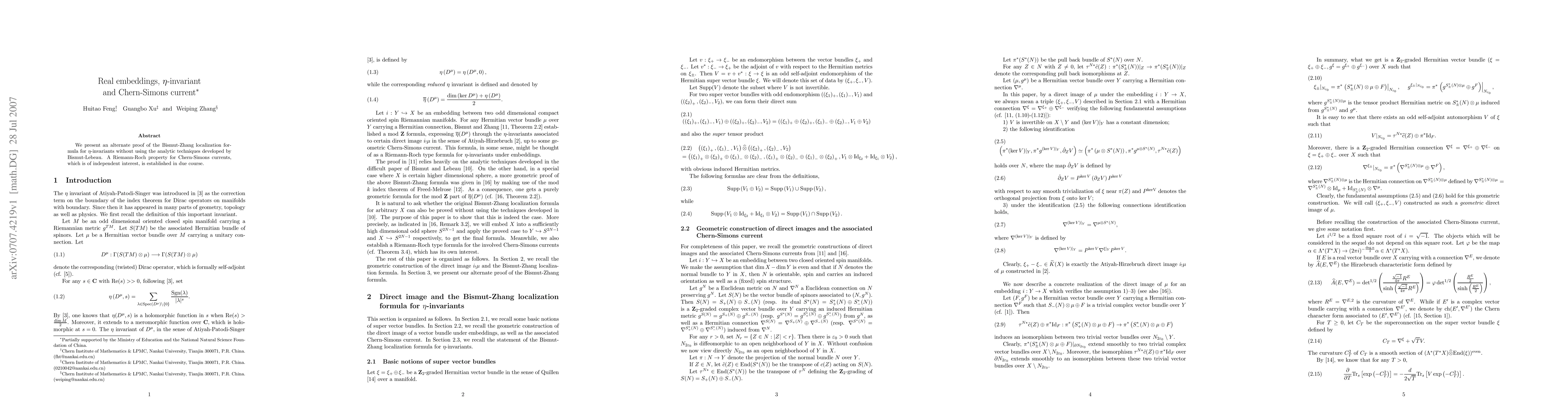 This paper provides an alternative proof of the Bismut-Zhang localization formula for $\eta$-invariants, avoiding traditional analytic methods. It also establishes a Riemann-Roch property for Chern-Simons currents.