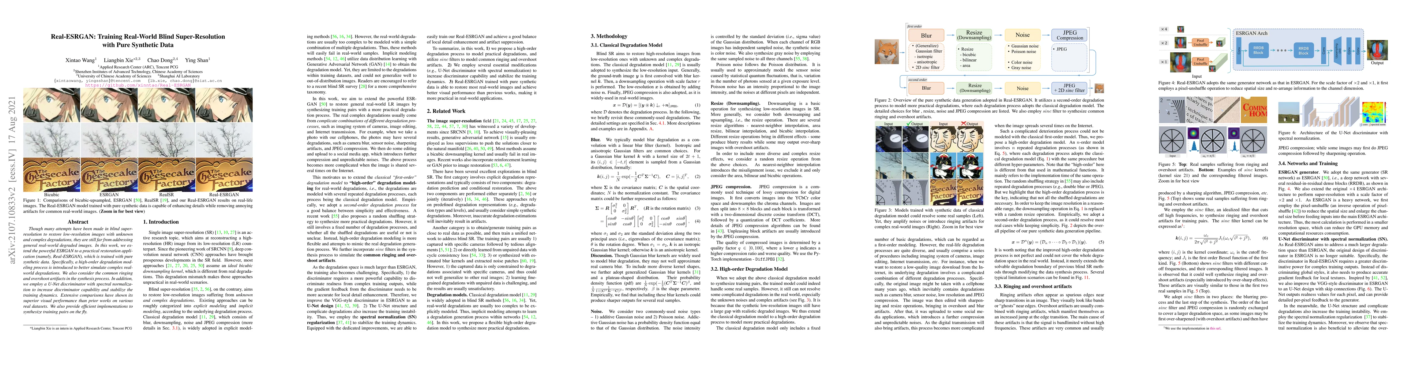 The paper extends ESRGAN for blind super-resolution of real-world degraded images using pure synthetic data. It introduces a high-order degradation modeling process and considers ringing and overshoot artifacts. A U-Net discriminator with spectral normalization is employed to enhance discriminator capability and stabilize training dynamics.