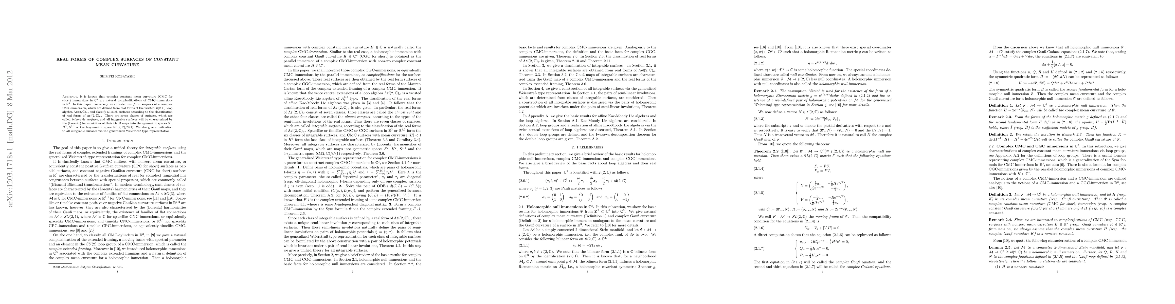 It is known that complex constant mean curvature ({\sc CMC} for short) immersions in $\mathbb C^3$ are natural complexifications of {\sc CMC}-immersions in $\mathbb R^3$. In this paper, conversely we consider {\it real form surfaces} of a complex {\sc CMC}-immersion, which are defined from real forms of the twisted $\mathfrak{sl}(2, \mathbb C)$ loop algebra $\Lambda \mathfrak{sl}(2, \mathbb C)_\sigma$, and classify all such surfaces according to the classification of real forms of $\Lambda \mathfrak{sl}(2, \mathbb C)_\sigma$. There are seven classes of surfaces, which are called {\it integrable surfaces}, and all integrable surfaces will be characterized by the (Lorentz) harmonicities of their Gau{\ss} maps into the symmetric spaces $S^2$, $H^2$, $S^{1,1}$ or the 4-symmetric space $SL(2, \mathbb C)/U(1)$. We also give a unification to all integrable surfaces via the generalized Weierstra{\ss} type representation.