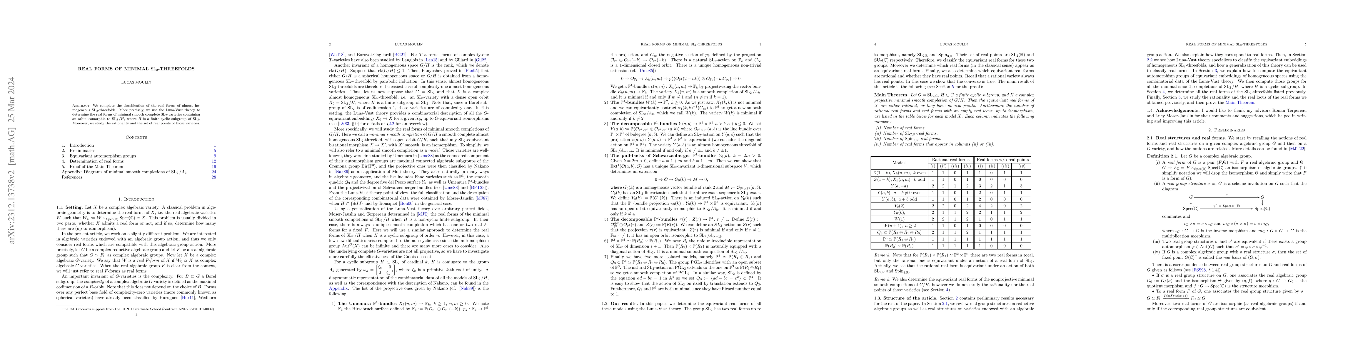 This paper classifies the real forms of minimal SL$_2$-threefolds using Luna-Vust theory and examines their rationality and real point sets. The focus is on almost homogeneous SL$_2$-varieties containing an orbit isomorphic to SL$_2/H$, where $H$ is a finite cyclic subgroup of SL$_2$.