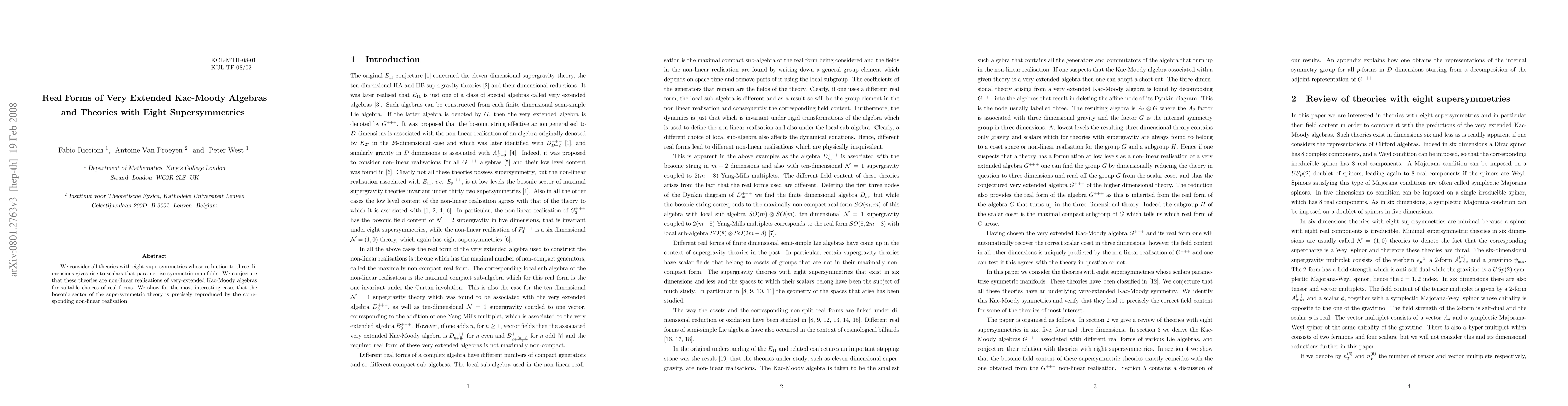 This paper explores theories with eight supersymmetries that reduce to three dimensions and yield scalars parametrizing symmetric manifolds. The authors conjecture these theories are non-linear realizations of very-extended Kac-Moody algebras in specific real forms, and demonstrate this for key cases in the bosonic sector.