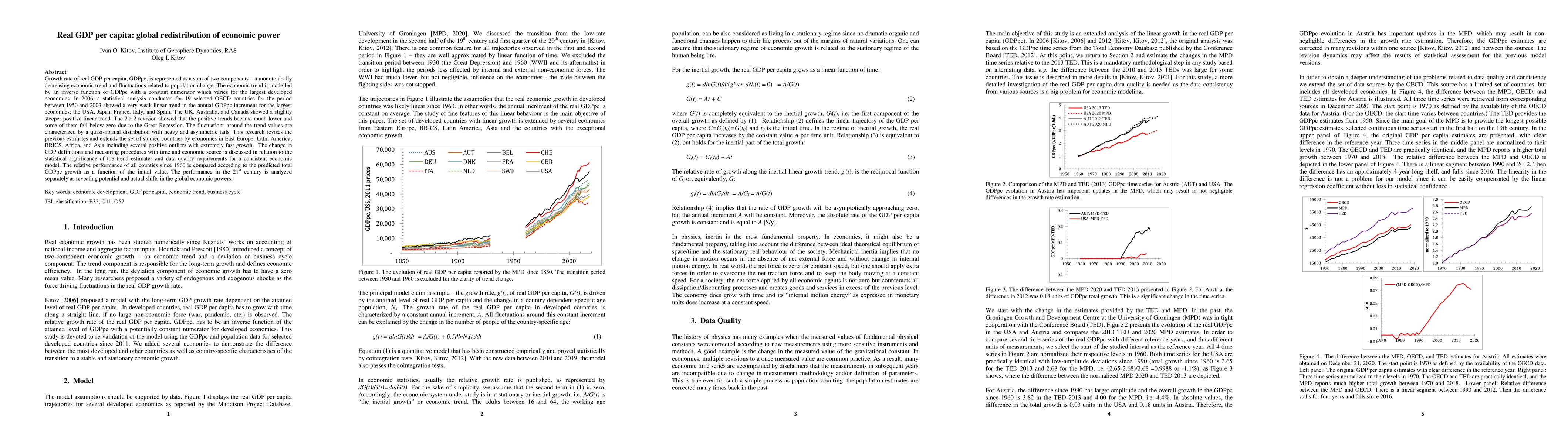 This paper analyzes the growth rate of real GDP per capita (GDPpc) across selected OECD and other global economies, identifying a weak linear trend in GDPpc increments for major developed economies and significant fluctuations due to population changes. It highlights shifts in global economic power, noting that some emerging economies have experienced extremely rapid growth, while others have seen declines post-2008.