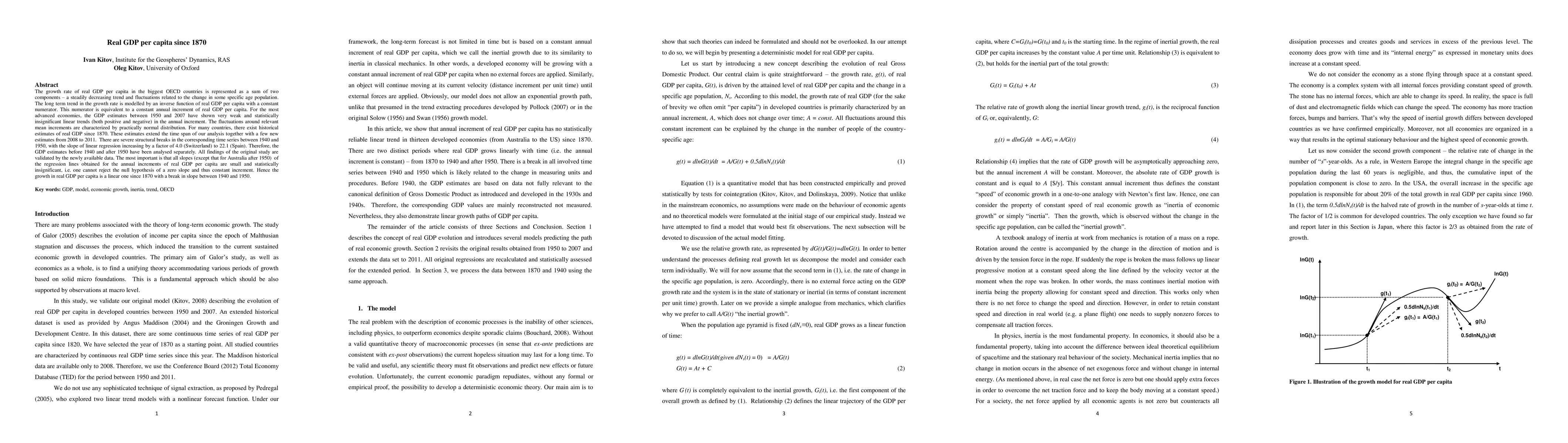 The paper analyzes real GDP per capita growth in major OECD countries since 1870, finding a linear trend with a significant break in slope between 1940 and 1950. Despite fluctuations, the annual increment of real GDP per capita remains statistically insignificant since 1950.