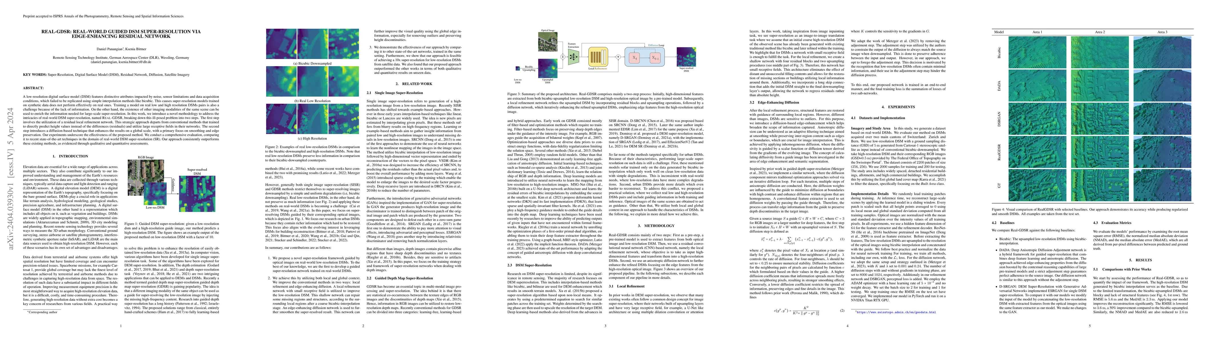 This paper introduces REAL-GDSR, a novel methodology for real-world DSM super-resolution that combines a residual local refinement network with a diffusion-based global enhancement technique. The approach outperforms existing methods by focusing on residuals instead of direct height predictions and emphasizing edge preservation.