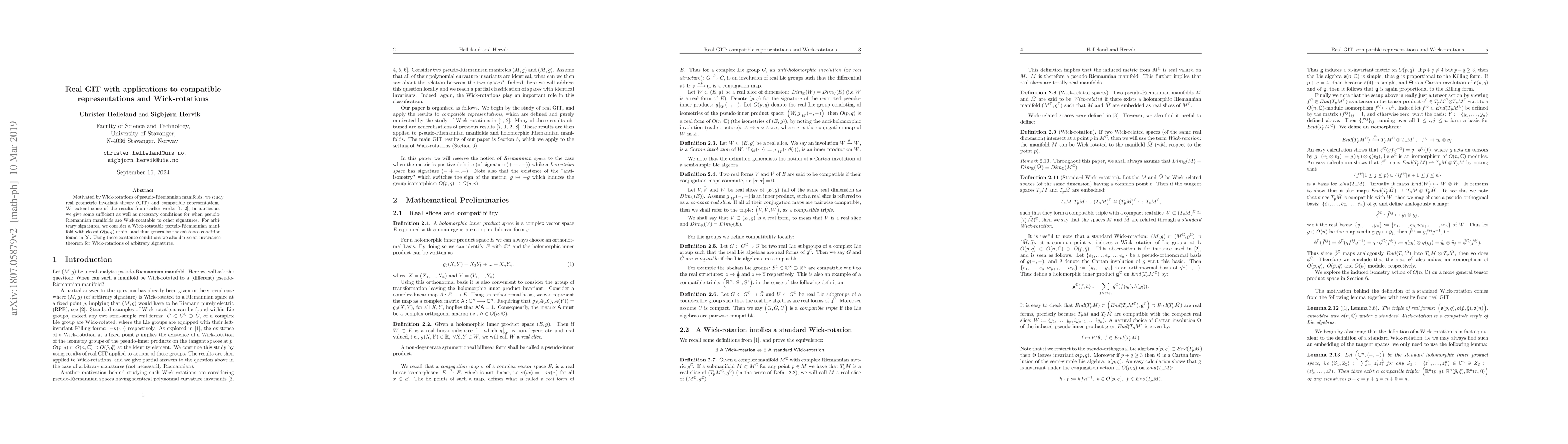 Motivated by Wick-rotations of pseudo-Riemannian manifolds, we study real geometric invariant theory (GIT) and compatible representations. We extend some of the results from earlier works \cite{W2,W1}, in particular, we give some sufficient as well as necessary conditions for when pseudo-Riemannian manifolds are Wick-rotatable to other signatures. For arbitrary signatures, we consider a Wick-rotatable pseudo-Riemannian manifold with closed $O(p,q)$-orbits, and thus generalise the existence condition found in \cite{W1}. Using these existence conditions we also derive an invariance theorem for Wick-rotations of arbitrary signatures.