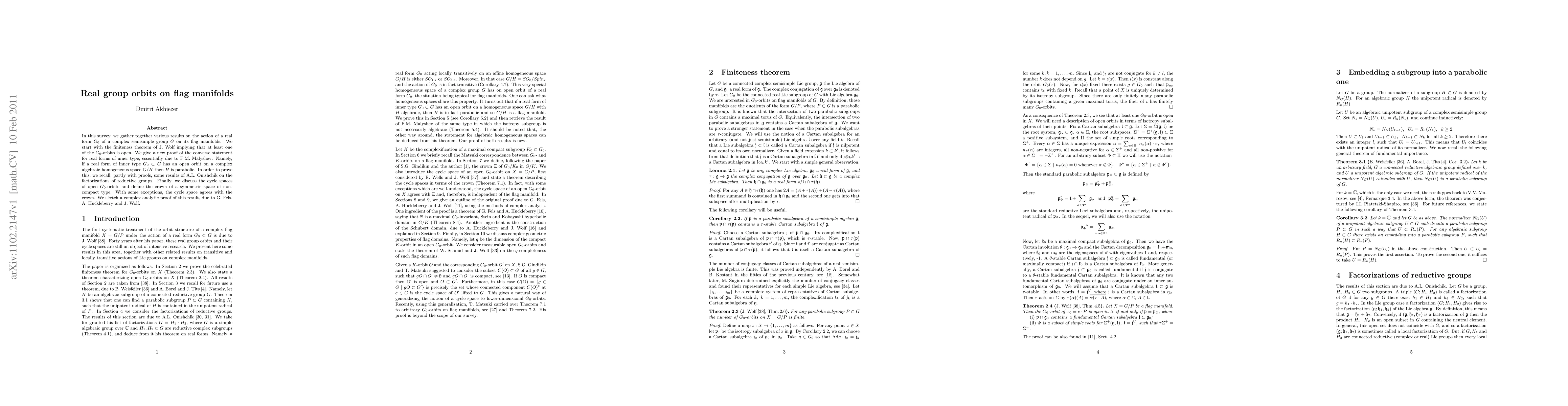 This paper surveys results on the action of real forms of complex semisimple Lie groups on their flag manifolds, proving the finiteness of orbits and the converse statement for real forms of inner type. It also discusses cycle spaces and the crown of symmetric spaces, providing a complex analytic proof for these concepts.