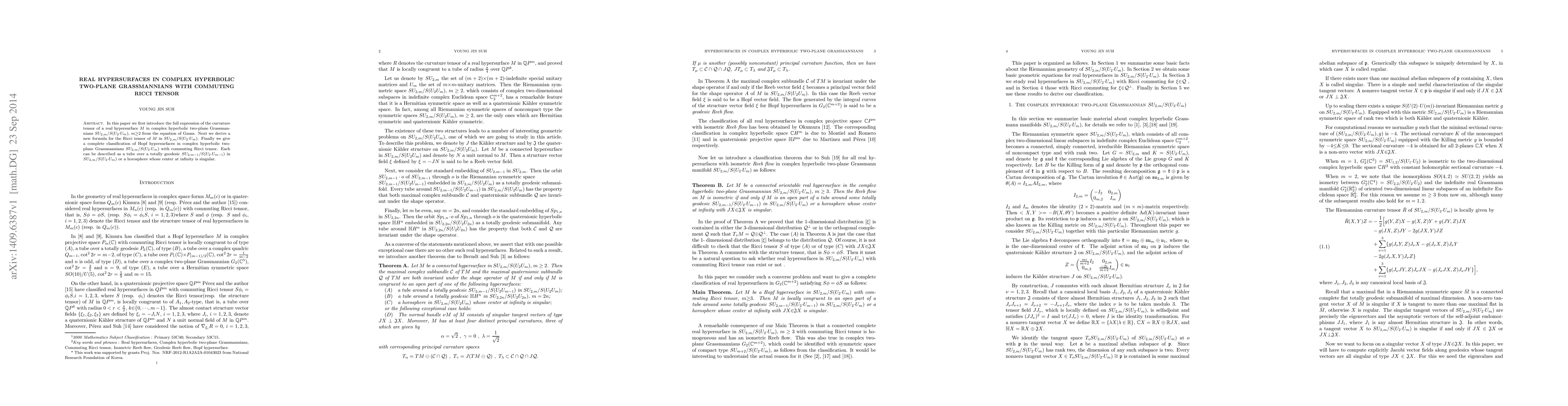 This paper classifies Hopf hypersurfaces in complex hyperbolic two-plane Grassmannians with a commuting Ricci tensor, showing they are either tubes over lower-dimensional structures or singular horospheres. The study derives the Ricci tensor formula and the full curvature tensor expression from Gauss' equation.