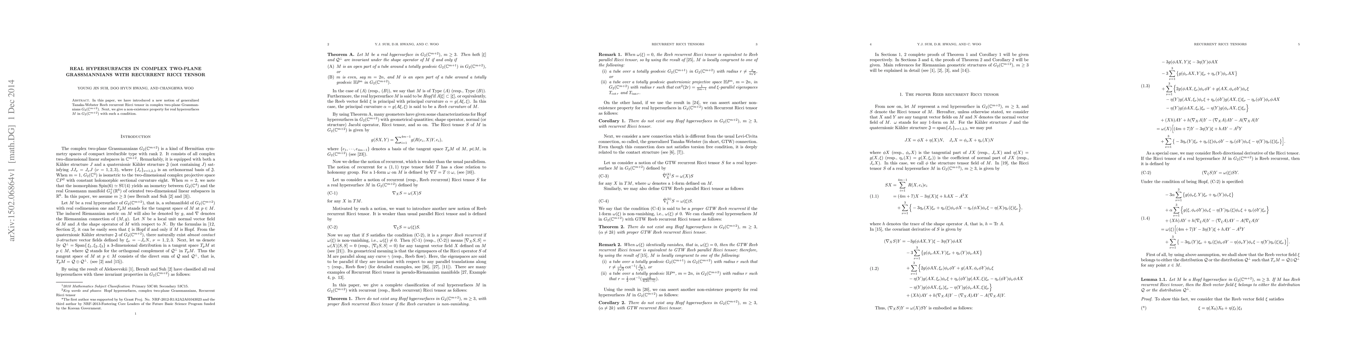 This paper introduces a generalized Tanaka-Webster Reeb recurrent Ricci tensor in complex two-plane Grassmannians and proves that real hypersurfaces in these spaces do not exhibit this condition.