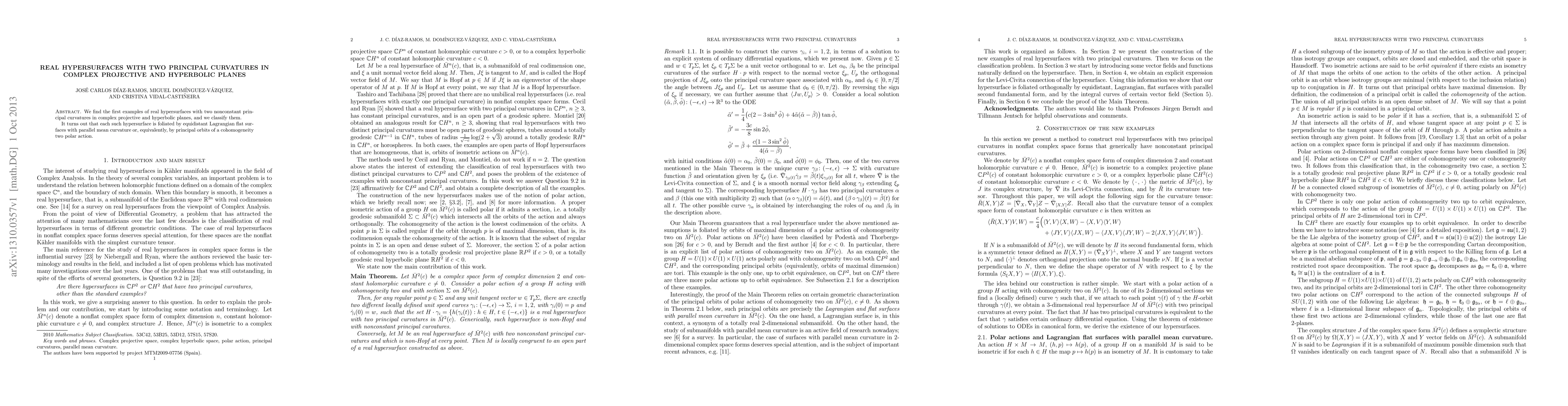 Summary: The paper presents the first examples of real hypersurfaces in complex projective and hyperbolic planes with two nonconstant principal curvatures, classifying them as foliated by equidistant Lagrangian flat surfaces with parallel mean curvature.